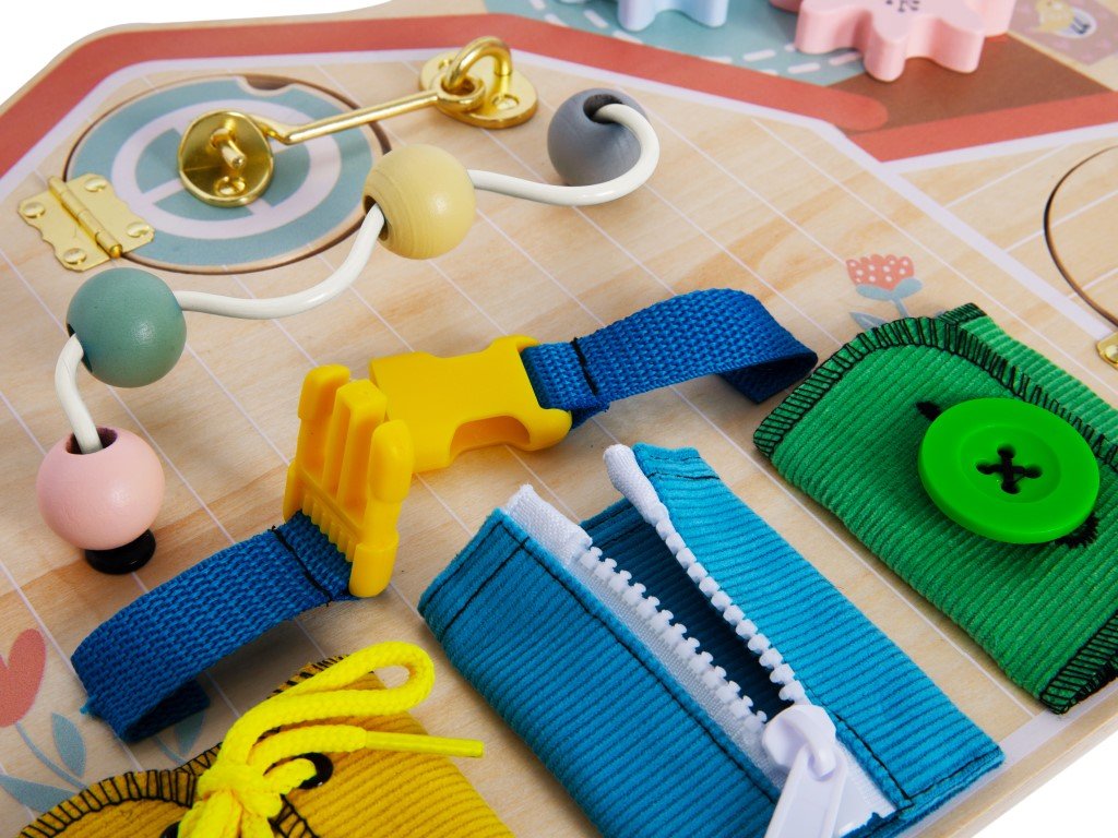 - Vzdělávací prvky - naučí děti praktickým dovednostem. Různé druhy zapínání - přezka, zip, knoflík, tkaničky, naučí děti samostatnosti nejen v oblékání. Zavírací okénko i dvířka naučí děti zdolávat různé druhy zavírání.