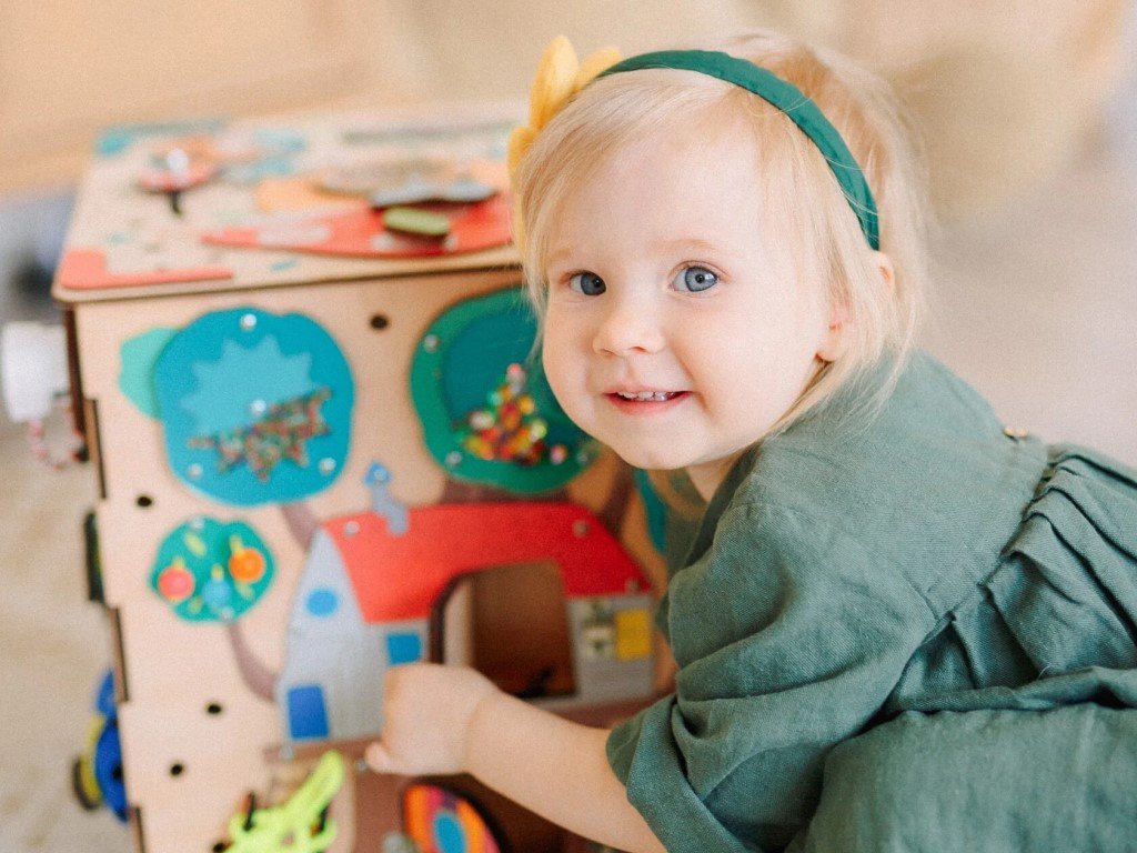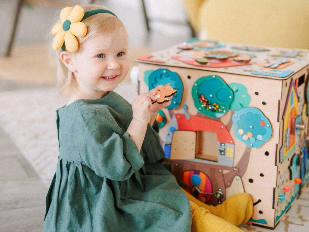 Activity board v podobě kostky je složen z pěti desek s hracími a montessori prvky zaměřenými na zručnost, logiku, kreativitu a trpělivost. Kostka vtáhne děti do světa objevování a fantazie, kde si děti samy hrají a učí se tím nejpřirozenějším způsobem, pomocí hry.