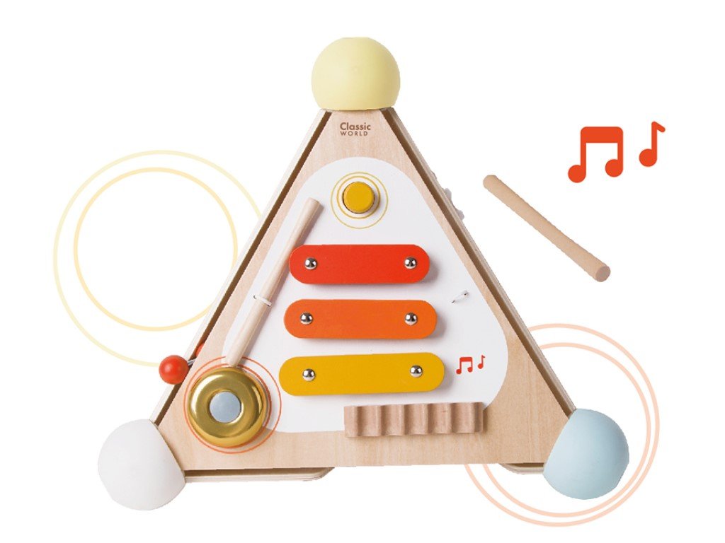 Originální activity board pro děti ve tvaru pyramidy si pro holčičky i chlapce připravil nejedno dobrodružství. Každá strana activity boardu je originální, zaměřená na zdokonalování dětských dovedností pomocí zábavné hry. Strana s vkládačkou potrénuje motorické dovednosti, soustředění, trpělivost, koordinaci očí a rukou a seznámí děti s tvary. Hudební strana s xylofonem a hudebními prvky stimuluje dětské smysly, seznámí děti se zvuky, tóny a probudí v nich zájem o hudbu a hudební nástroje. Na straně se zrcátkem se děti seznámí s mimikou tváře, mohou zkoušet různé úsměvy, mrkat, šklebit se a při tom se pozorovat v zrcátku. Při tomto sebeobjevování si děti jistě užijí spoustu legrace. Ozubená kola na poslední straně zavedou děti do vesmíru, kde zdokonalí motorické dovednosti, logické myšlení a popustí uzdu své fantazii.