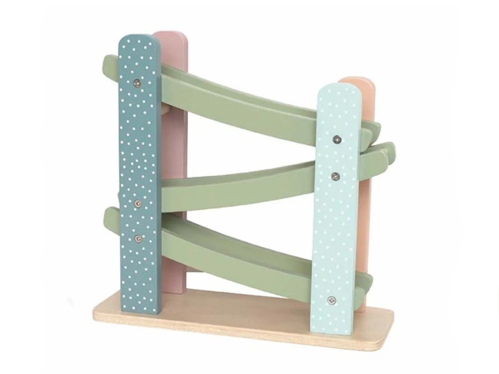 Dřevěná autodráha (závodní dráha) s 3 závodními auty různé barvy a motivem medvídka umožní dětem uspořádat závody přímo ve svém dětském pokojíčku. Tato dřevěná hračka zabaví děti i dospělé. Stačí si mezi 3 autíčky s medvídkem vybrat svého favorita a postavit jej na start, tedy na nejvyšší bod závodní dráhy. Po spuštění stačí už jen sledovat, jak závodní auto prosviští jednotlivá patra autodráhy. Díky neutrálním barvám je závodní dráha vhodná pro holčičky i chlapce. Při hře s autodráhou děti potrénují motorické dovednosti, koordinaci očí a rukou, naučí se soustředit se a užijí si spoustu zábavy.