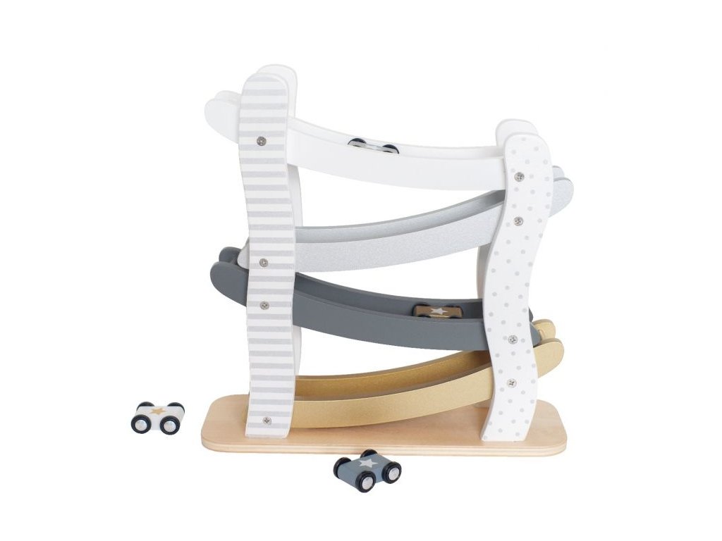 Krásná dřevěná autodráha v zajímavých barvách s moderními proužky a puntíky se hodí do pokojíčků kluků i holčiček.