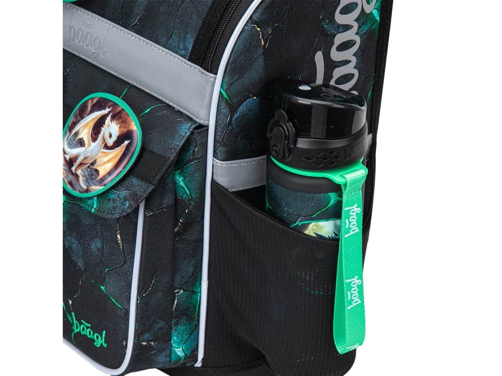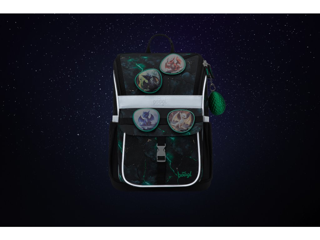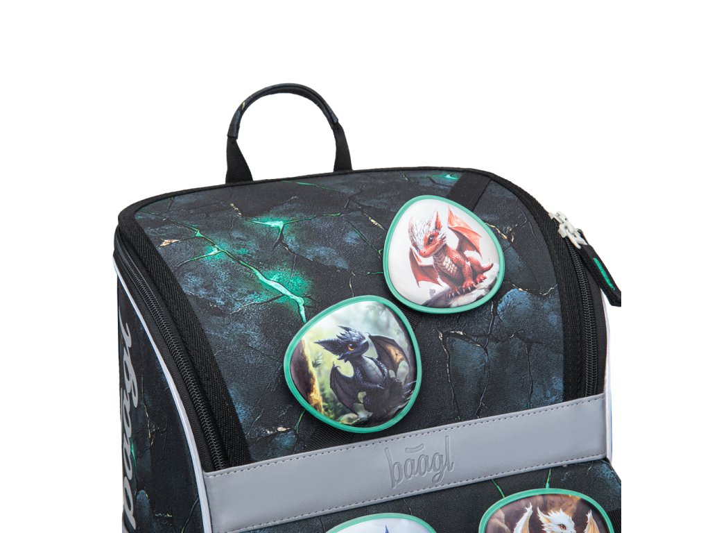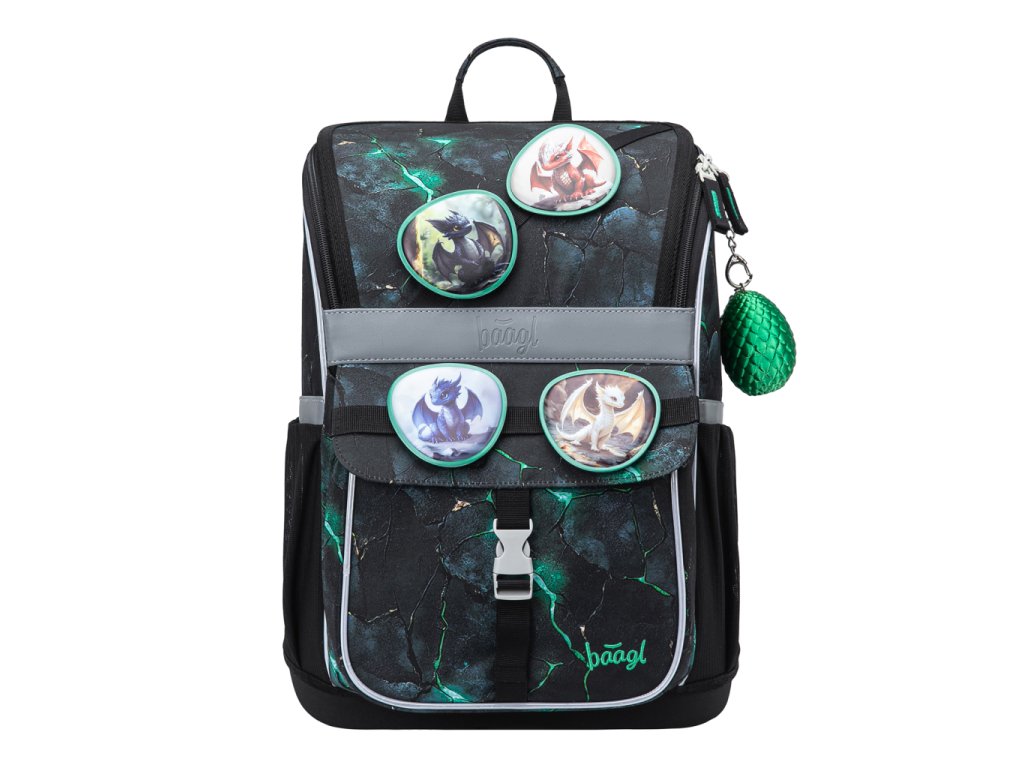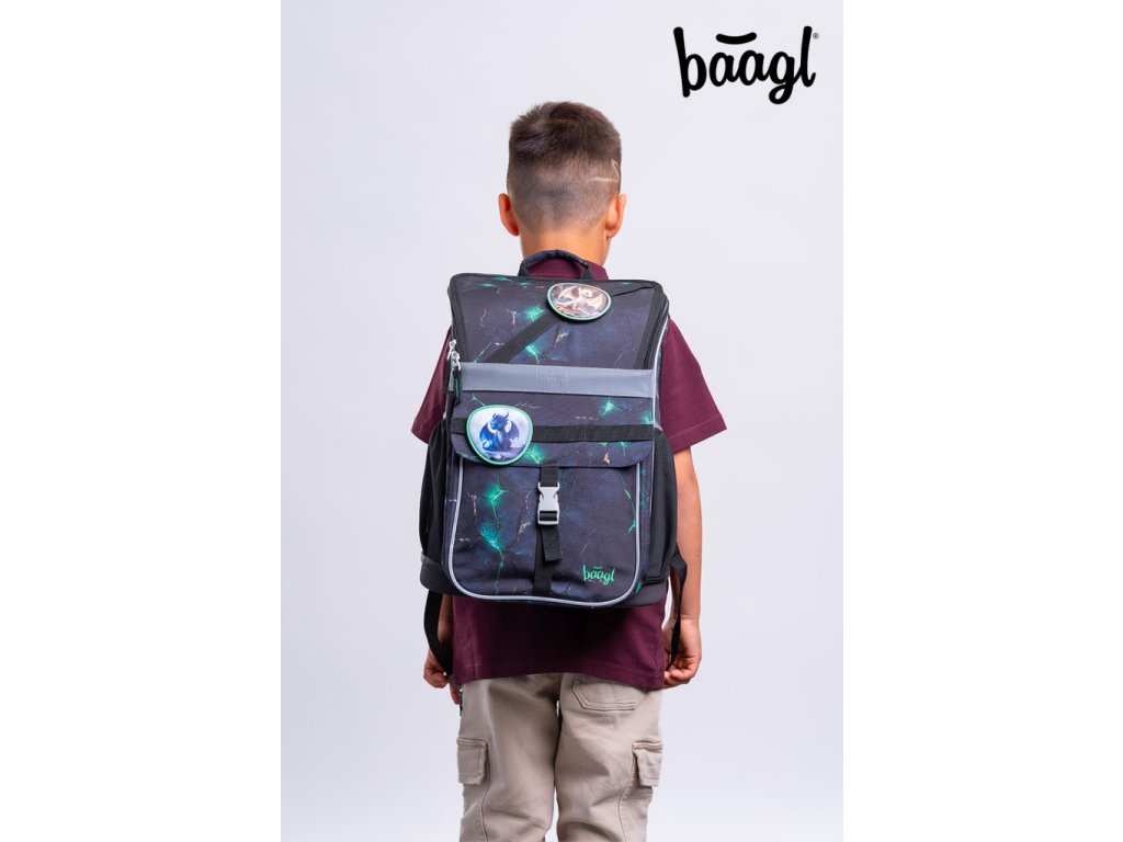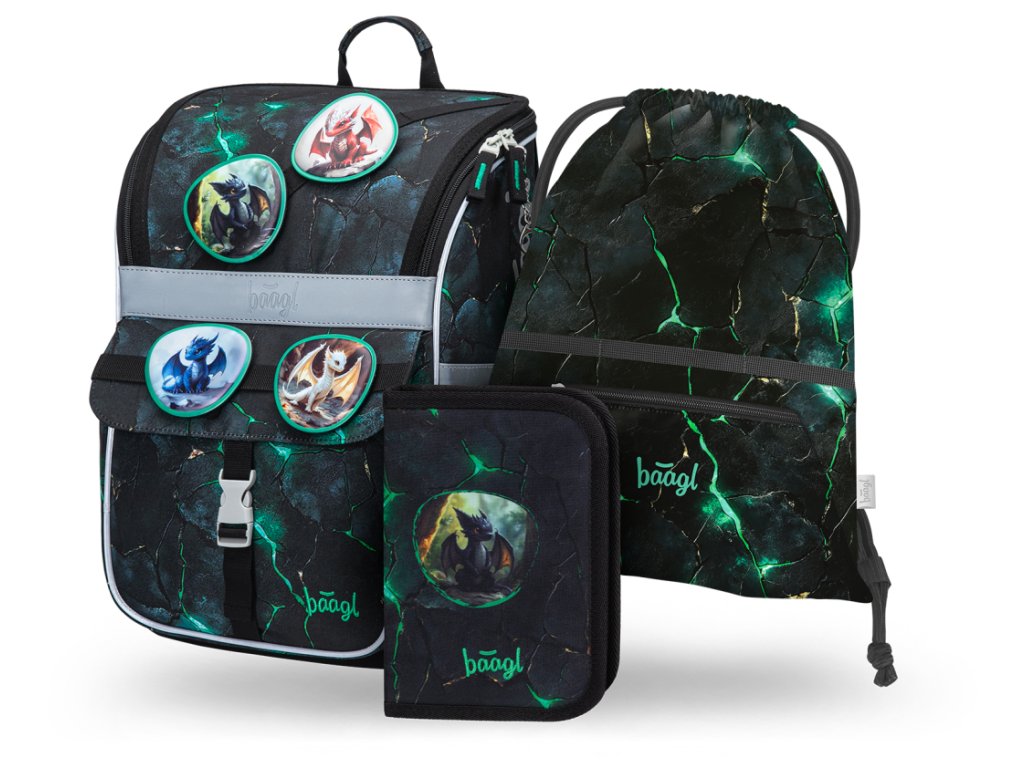 BAAGL SET 3 Zippy Draci tvoří lehká ergonomická aktovka, penál a praktický sáček na přezůvkyAktovka do školy má nastavitelný zádový systém, reflexní prvky a vyměnitelné odznáčky – ideální set pro děti od 1. třídy ZŠ.