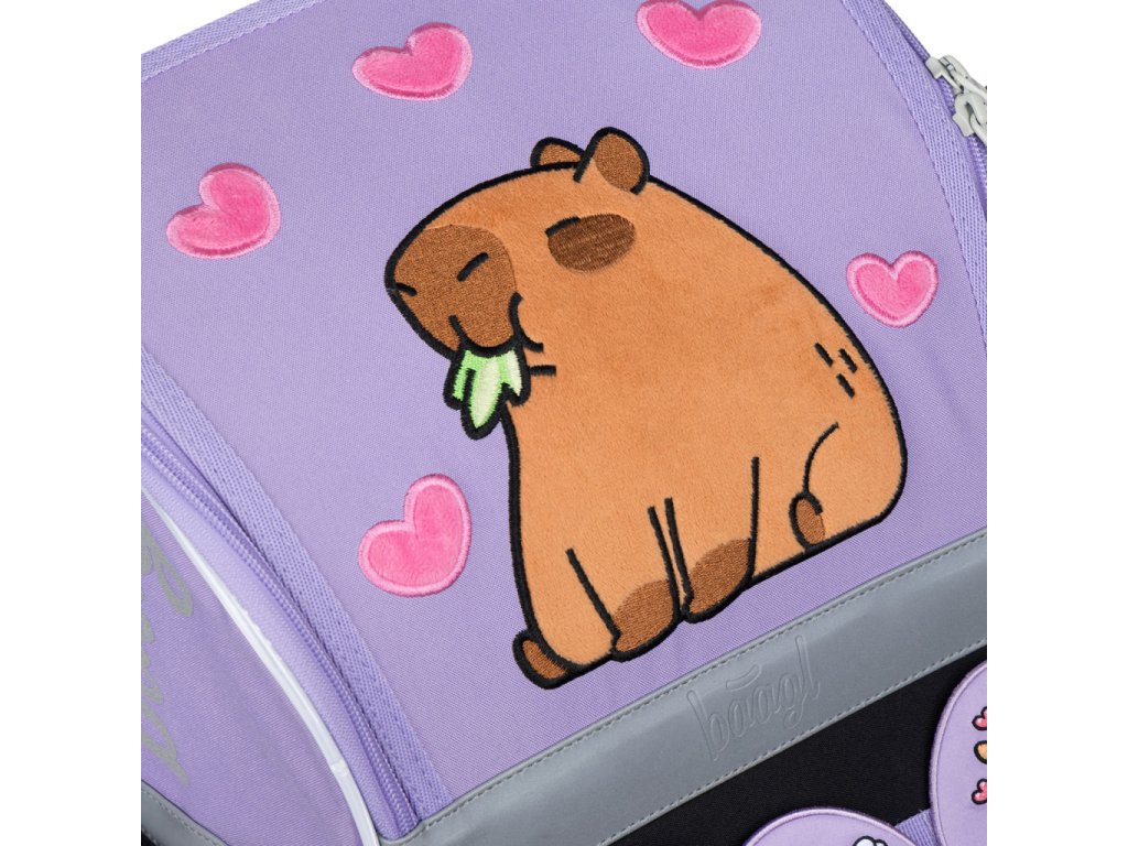 Unikátní systém vyměnitelných odznáčků umožňuje přizpůsobit vzhled aktovky podle nálady a zájmů dítěte. Každou školačku potěší roztomilý přívěsek v podobě kapybary.