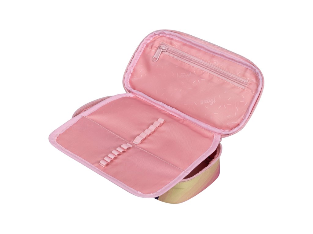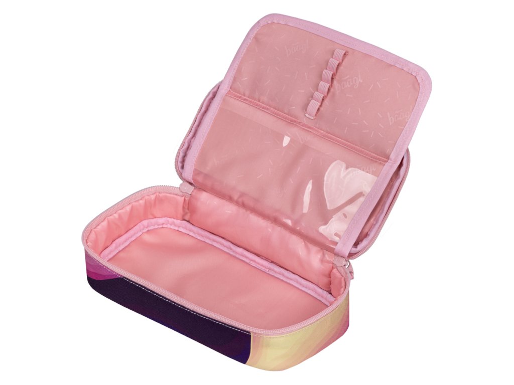 • Kompaktní penál na zip s prostornou hlavní komorou a dvojitou výklopnou chlopní nabízí dostatek prostoru pro psací potřeby i drobnosti.• Součástí penálu je také vnitřní kapsa a okénko na rozvrh hodin.
