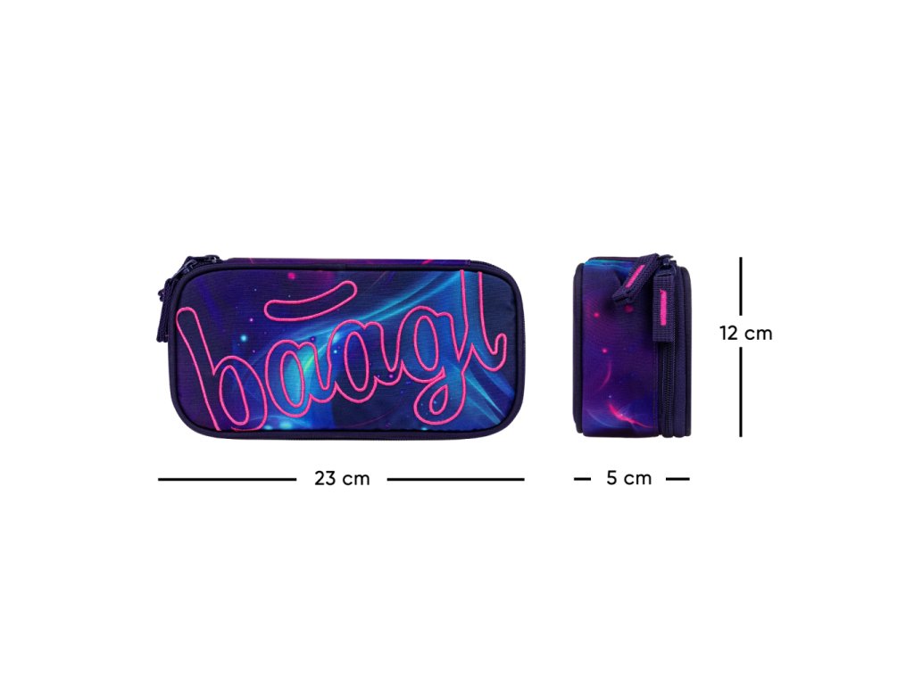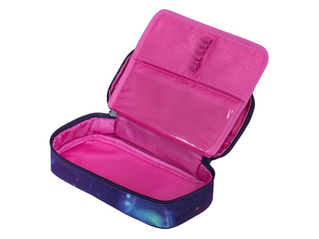 • Kompaktní penál na zip s prostornou hlavní komorou a dvojitou výklopnou chlopní nabízí dostatek prostoru pro psací potřeby i drobnosti.• Součástí penálu je také vnitřní kapsa a okénko na rozvrh hodin.