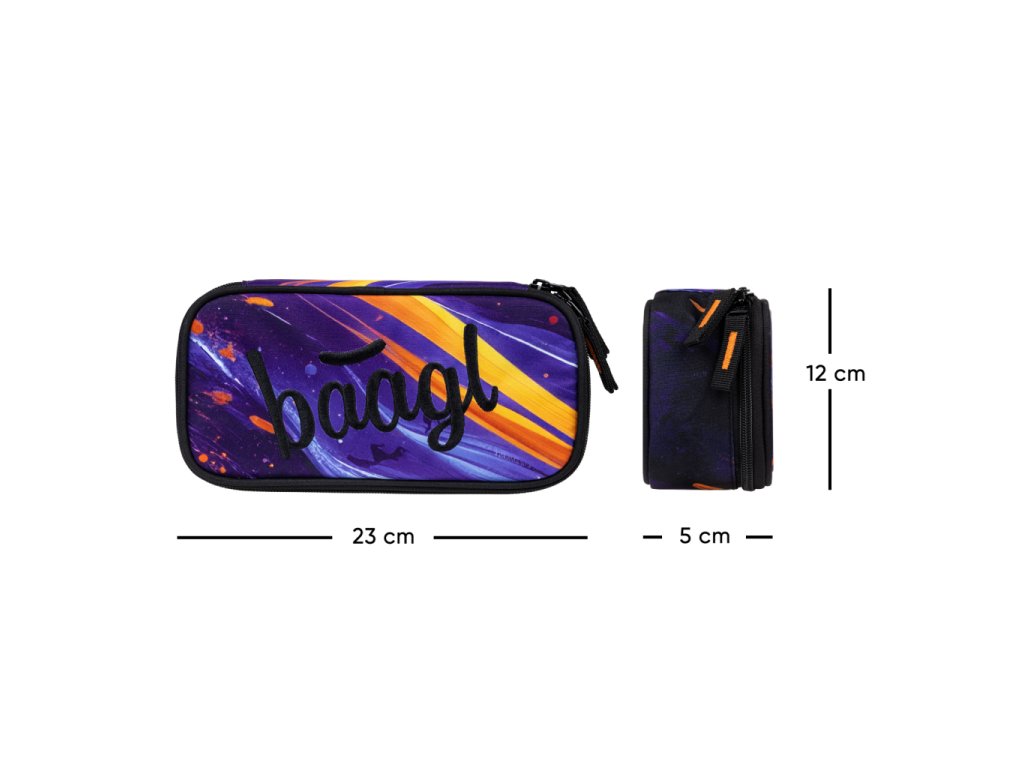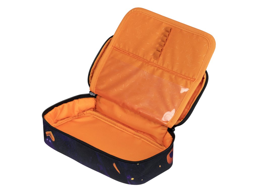 • Kompaktní penál na zip s prostornou hlavní komorou a dvojitou výklopnou chlopní nabízí dostatek prostoru pro psací potřeby i drobnosti.• Součástí penálu je také vnitřní kapsa a okénko na rozvrh hodin.