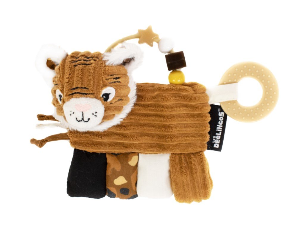 Chrastítko pro miminka z úžasně heboučkého materiálu, v podobě roztomilého tygříka, si pro děti připravilo spoustu prvků (rolničku, korálky, různé materiály), které rozvíjí jemnou motoriku a stimulují smysly. Nechybí ani kousátko, které masíruje dětské dásně a ulevuje od bolesti při prořezávání prvních zoubků. Heboučký tygr v podobě chrastítka si rychle najde své místo v dětské postýlce, v kočárku nebo na hrací dece, vždy připravený ke hře, okusování, žužlání i lenošení.