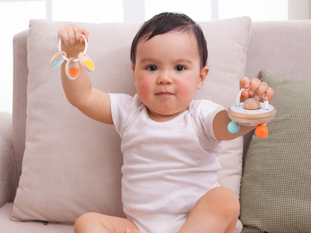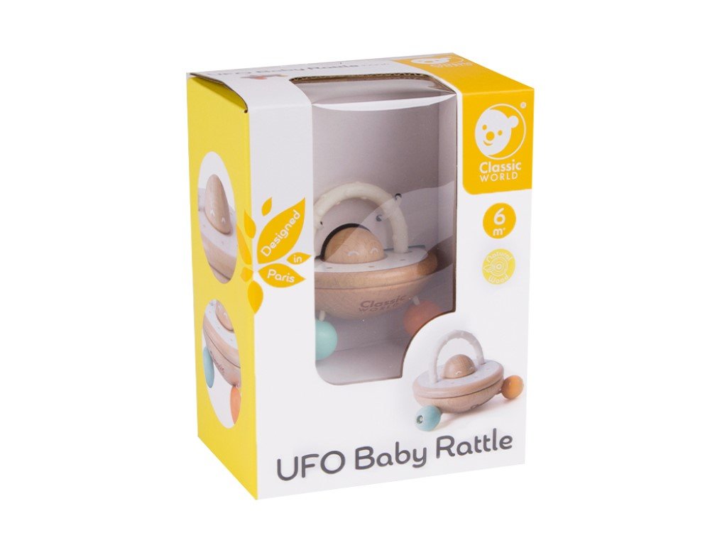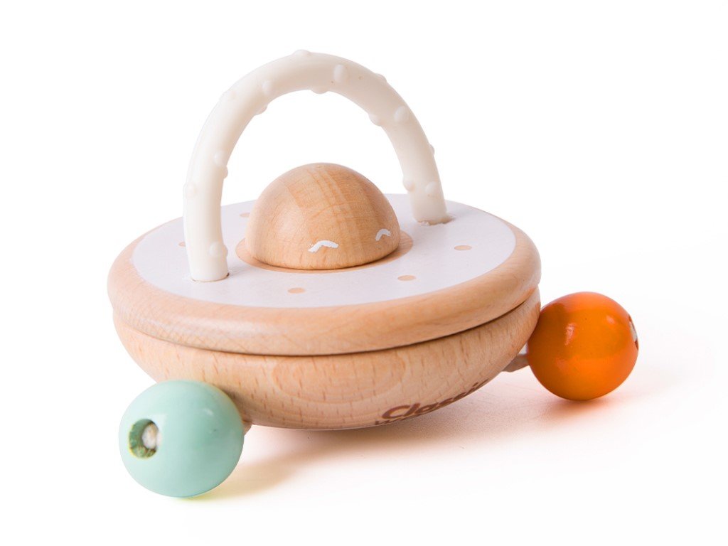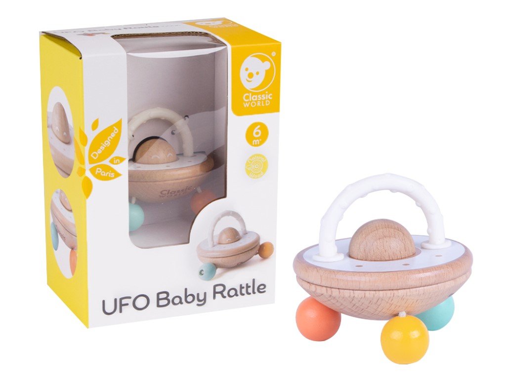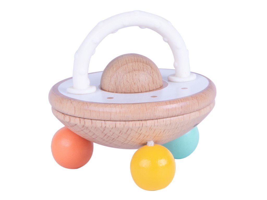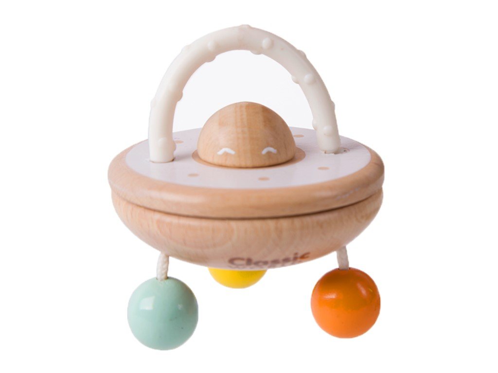 Když dítě zamává tímto chrastítkem a to začne vydávat zvuky, je to jako UFO létající vzduchem. Chrastítko přitahuje pozornost dětí a stimuluje jejich smysly barvami i zvukem. Součástí originálního chrastítka je i kousátko, za které mohou děti chrastítko uchopit, přenášet a chrastit s ním nebo je využijí k úlevě od bolesti při prořezávání prvních zoubků. Chrastítko s koustákem (2v1) v neutrálních barvách je vhodnou hračkou pro holčičky i kluky.