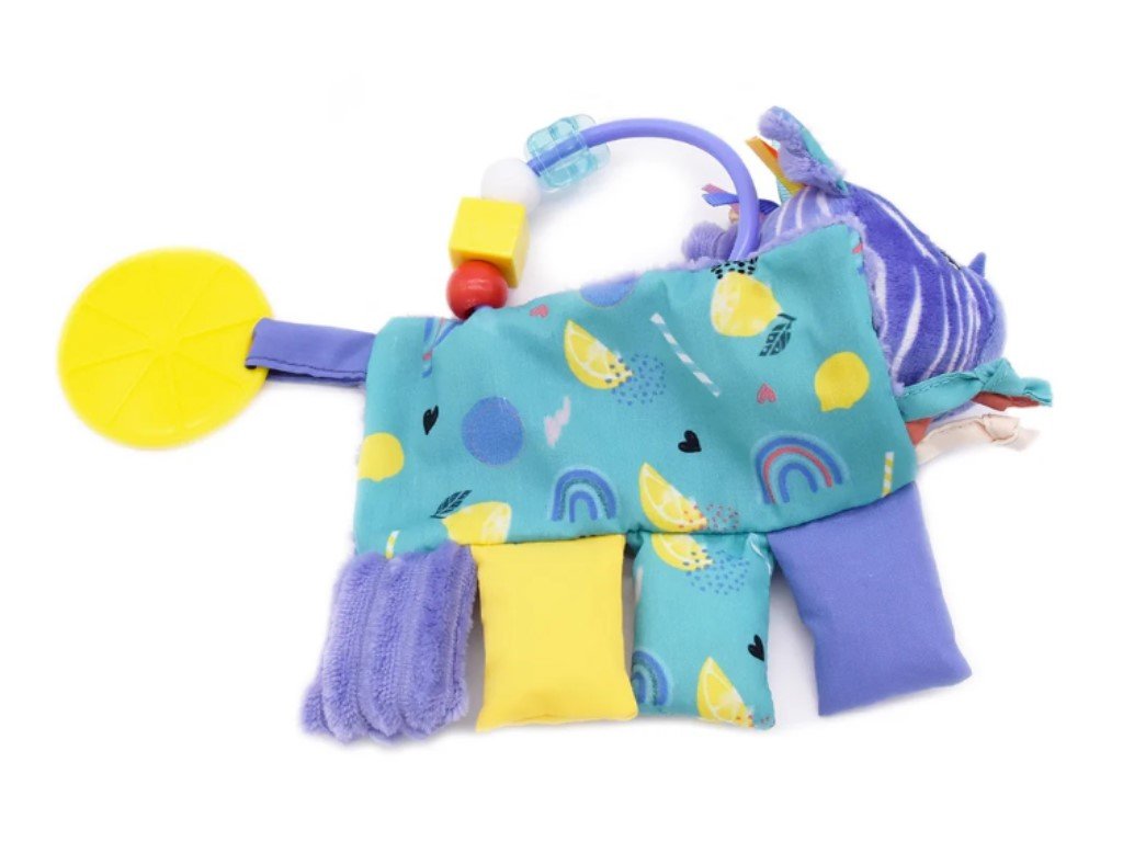 Chrastítko pro miminka od narození, ve fialové barvě, potěší vaše nejmenší. Hračka z úžasně heboučkého manšestrového materiálu, v podobě roztomilé zebřičky, dětem nabídne spoustu prvků (rolničku, korálky, různé materiály), které rozvíjí jemnou motoriku a stimulují smysly. Nechybí ani kousátko, které masíruje dětské dásně a ulevuje od bolesti při prořezávání prvních zoubků. Veselá zebra v podobě chrastítka si rychle najde své místo v dětské postýlce, v kočárku nebo na hrací dece, vždy připravená ke hře, okusování, žužlání i lenošení.