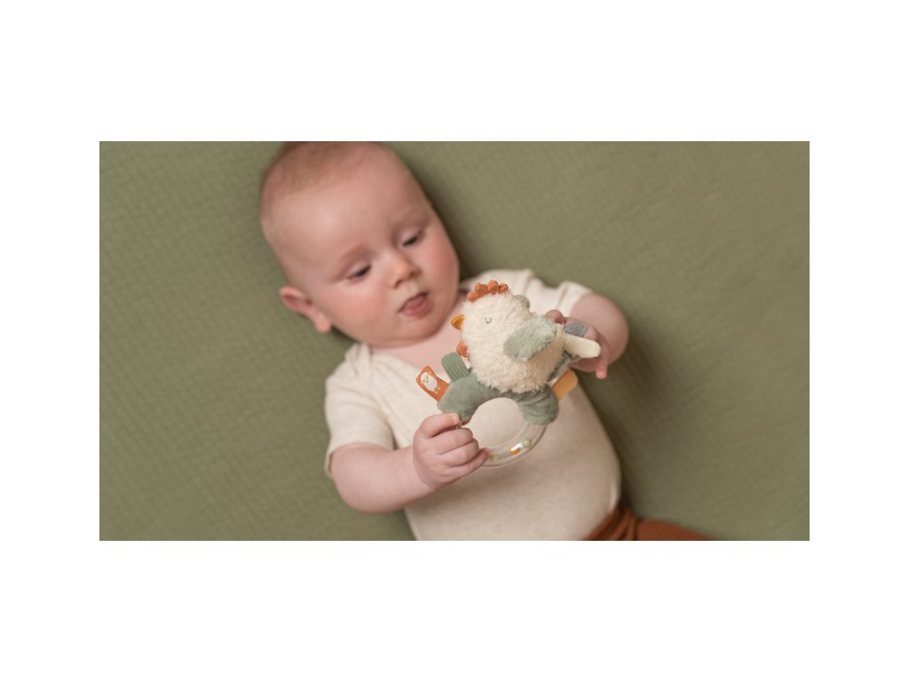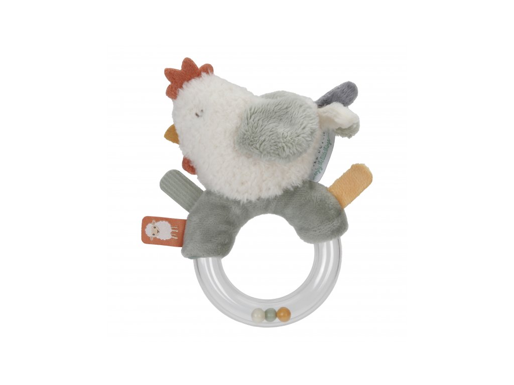 Originální chrastítko pro děti v podobě heboučké slepičky vykouzlí úsměv na tvářičce každého miminka. Stačí s plyšovou slepičkou zaštěrchat a barevné kuličky v průhledném kroužku začnou chrastit. Chrastítko má tvar pro snadné uchopení a různorodé textury pro zkoumání rukama i ústy. Křídla ptáčka při zmáčknutí šustí.