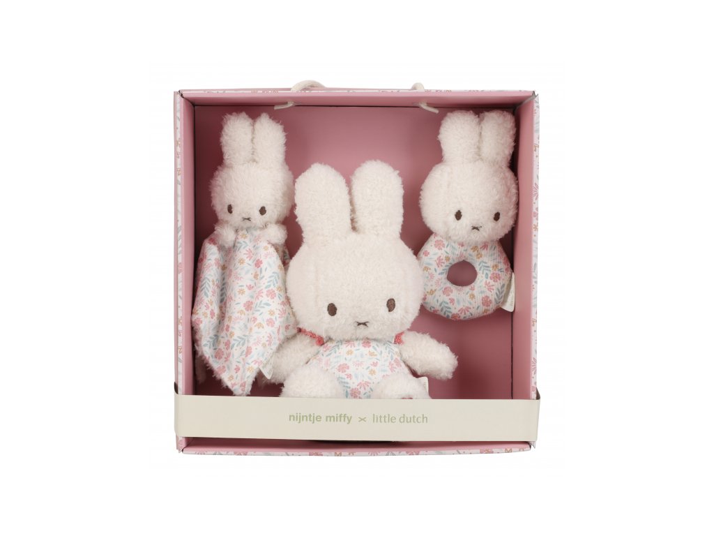 Dárkový box obsahuje tři hračky z jemného plyše a manšestru, které lákají ke hraní i mazlení před spaním v postýlce: králíčka, muchláčka a chrastítko. Hračky jsou vhodné pro děti od narození a sada se tak může stát i krásným dárkem pro novorozené miminko.Hračky jsou součástí kolekce hraček Little Dutch Miffy, jejichž ústřední postavou je roztomilá králičí holčička Miffy, známá z knížek pro děti holandského spisovatele Dicka Bruny.