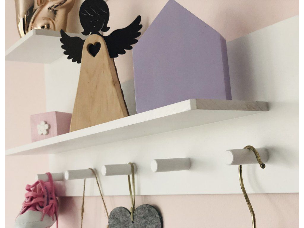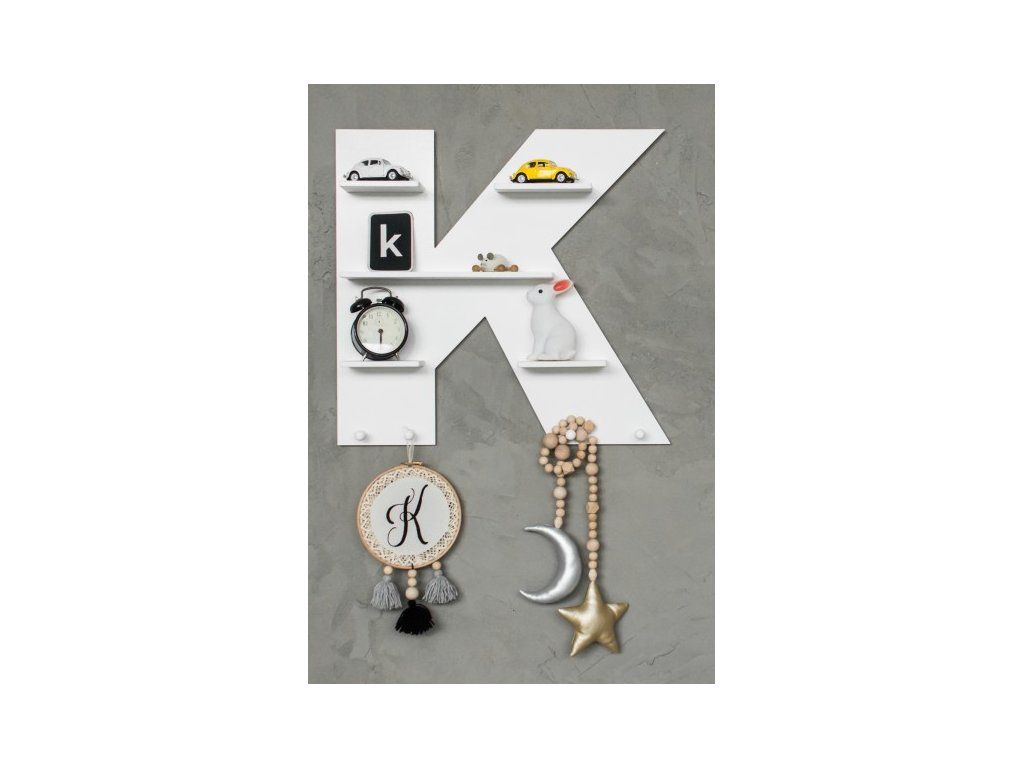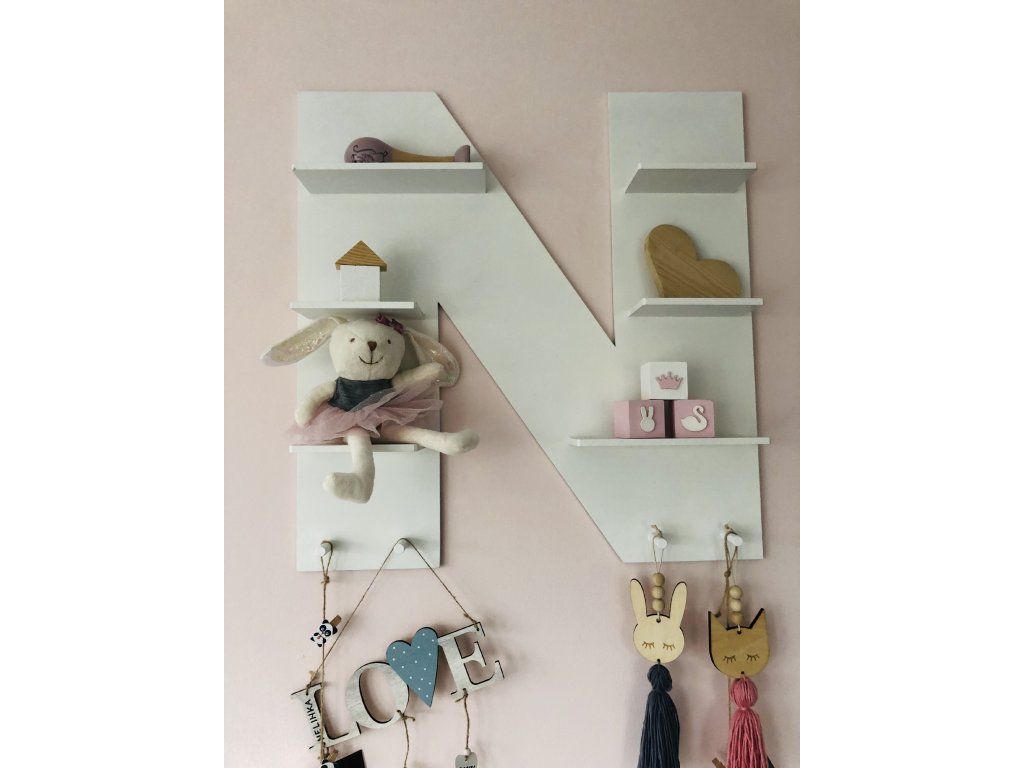 Praktická designová polička bílé barvy ve tvaru písmene, které může odpovídat počátečnímu písmenu jména vaší holčičky nebo chlapce, napoví každému, kdo je pánem v tomto dětském království. Zajímavostí této dekorace jsou malé poličky a věšáčky ve spodní části písmene k vystavení a zavěšení drobností, což děti zbožňují. Písmeno s poličkami je velice zajímavým prvkem do jakékoliv místnosti. Vybírejte u nás z více barev těchto jedinečných doplňků pro ještě dokonalejší doladění nejen dětského pokoje.