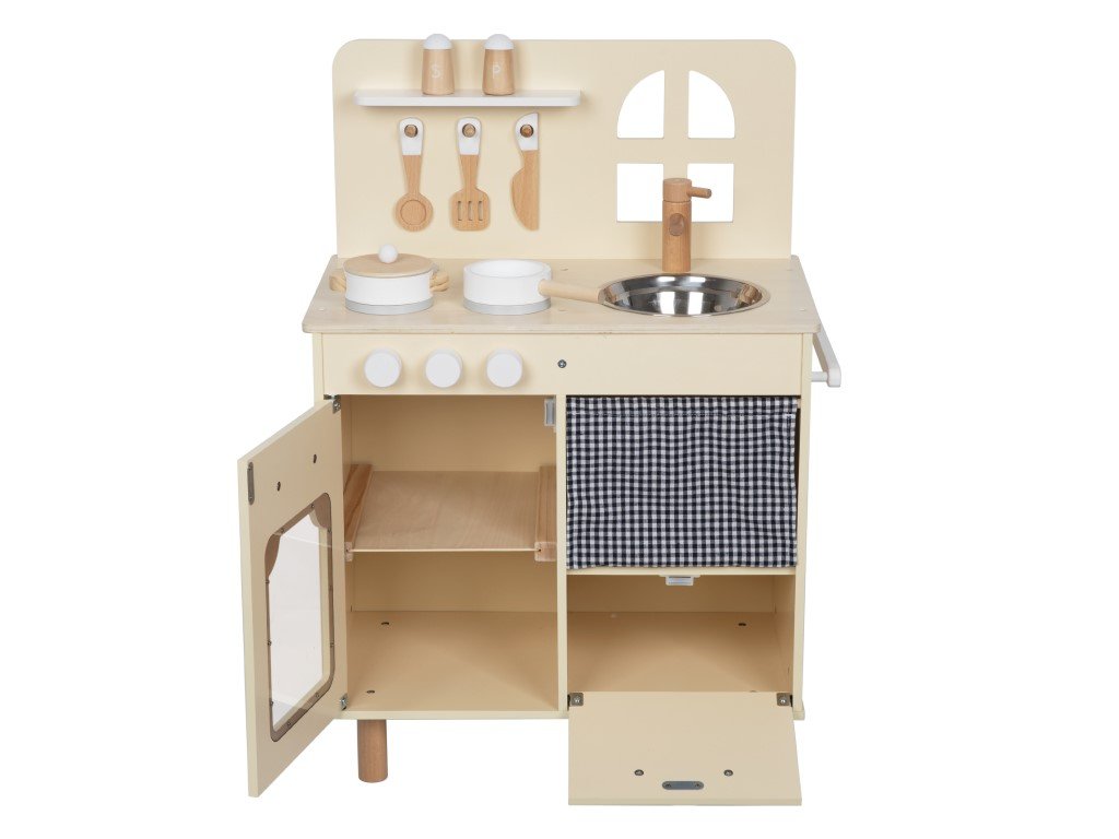 Dětská kuchyňka dřevěná je edukativní hračkou, která umožní dětem vyzkoušet si dospělácké činnosti - vaření, pečení, umývání nádobí, přípravu pokrmů, bezpečným dětským způsobem. V této kuchyňce se děti rychle vžijí do role mistra kuchaře, budou péct a vařit ze všech surovin, co ve vaší domácnosti najdou. Nechte se překvapit originálními kombinacemi a pokrmy, které vaše dítko vymyslí. Součástí kuchyňky jsou základní spotřebiče - pečící trouba a sporák se 2 plotýnkami, nechybí ani dřez na nádobí, úložné prostory, polička, závěsná tyč na boční straně kuchyňky. Kuchyňka je vybavena dřevěným nádobím - hrncem s poklicí, pánvičkou, kořenkami, vařečkou, obracečkou a nožem. Dětská kuchyňka je originální svým designem, okýnkem nad dřezem. Při hře v dětské kuchyňce děti zdokonalují motorické dovednosti, koordinaci očí a rukou, manuální zručnost, rozvíjí svou fantazii a kreativitu, hrají role, budují sociální vazby.