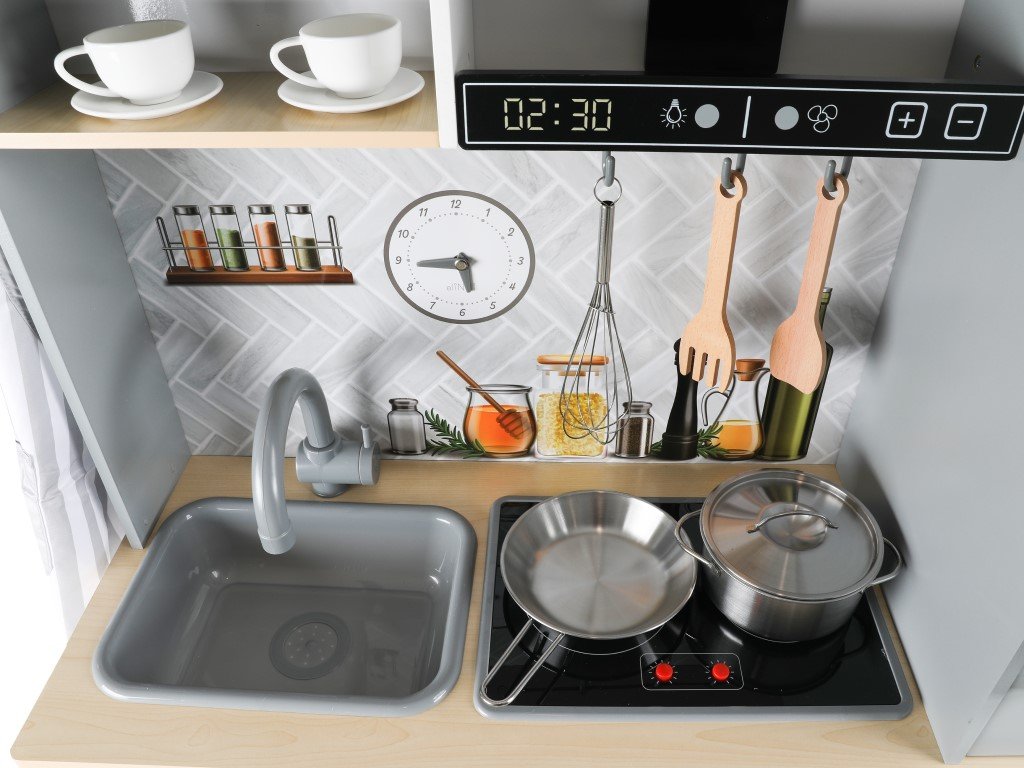 - Barevně neutrální - neutrální šedo-bílá barevná kombinace s přírodním dřevem dodávají dětské kuchyňce styl.