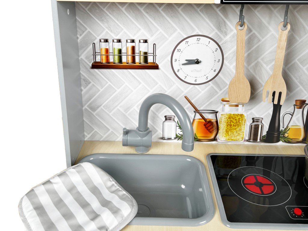 Dětská kuchyňka v moderním designu doplněná o spoustu úžasného příslušenství a textilní set ZDARMA je edukativní hračkou, která umožní dětem vyzkoušet si dospělácké činnosti - vaření, pečení, umývání nádobí, přípravu pokrmů, bezpečným dětským způsobem. V této kuchyňce se děti rychle vžijí do role mistra kuchaře, budou péct a vařit ze všech surovin, co ve vaší domácnosti najdou. Součástí kuchyňky jsou moderní spotřebiče - pečící a mikrovlnná trouba, sporák, myčka na nádobí, kávovar, lednice s ledovač, nechybí ani dřez na nádobí, digestoř, police, dřevěné a textilní příslušenství ZDARMA. Dětská kuchyňka je svým designem a skandinávským stylem vhodná do každé místnosti, kde si děti právě chtějí hrát. Při hře v dětské kuchyňce děti zdokonalují motorické dovednosti, koordinaci očí a rukou, manuální zručnost, rozvíjí svou fantazii a kreativitu, hrají role, budují sociální vazby.