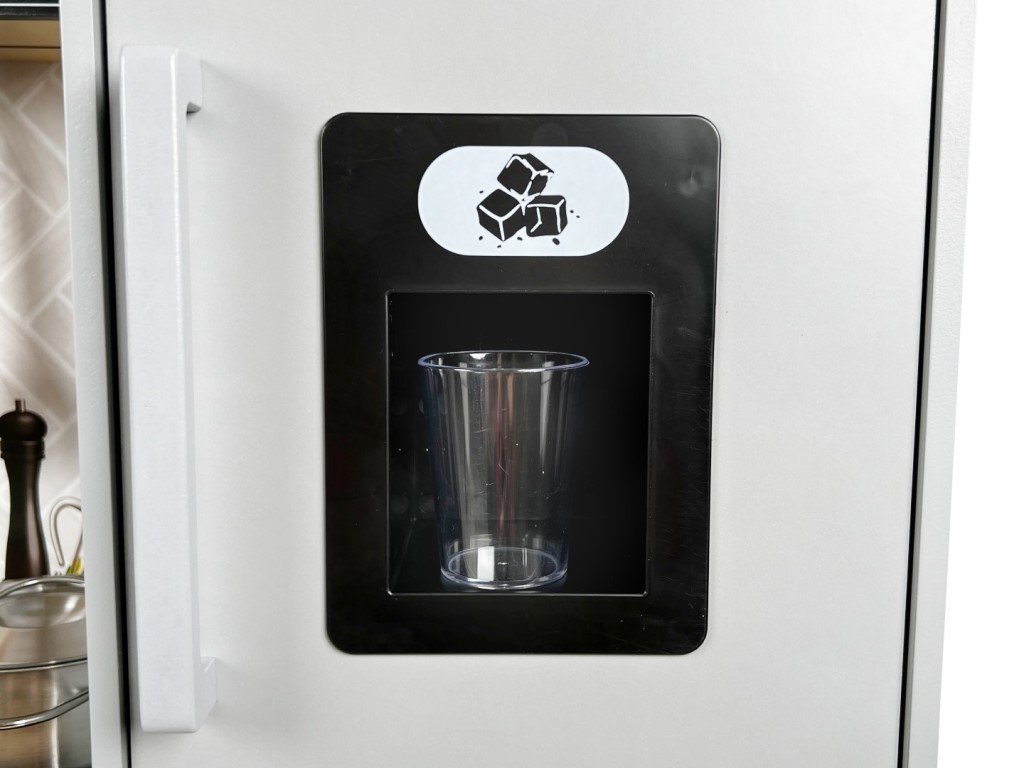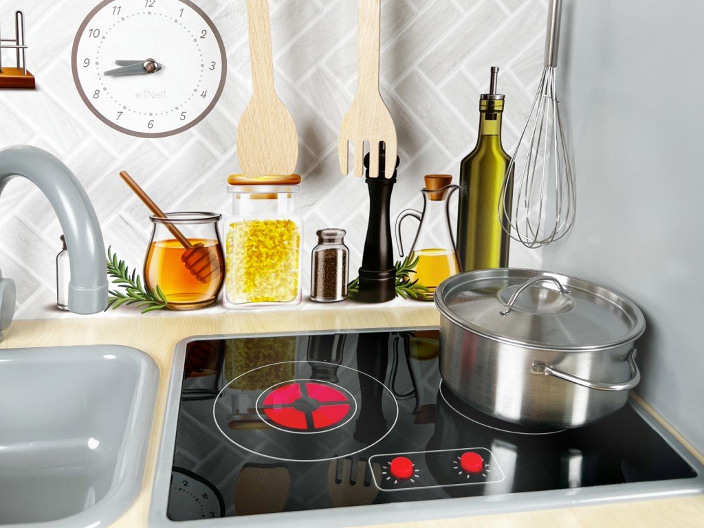 - Zvukové efekty - otočné ovladače k pečící troubě vydávají cvakavé zvuky, sporák po doplnění bateriemi vydává zvukové efekty (baterie nejsou součástí balení, doporučujeme je vložit při montáži z důvodu horší přístupnosti u kompletně smontované kuchyňky).