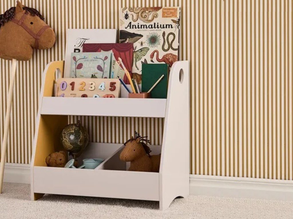 Dětská knihovna 2v1 je multifunkčním kouskem nábytku do dětského pokoje, je knihovnou i regálem v jednom. Snadno přístupné úložné prostory ve spodní části budou ideální pro uložení hraček a vrchní část je přímo stvořená pro vystavení knih s nejoblíbenějšími příběhy. Spojení šedé barvy s výraznou hořčicově žlutou rozjasní každý dětský pokojíček.