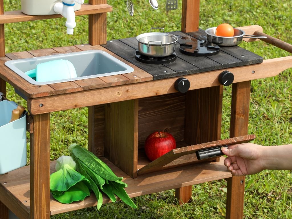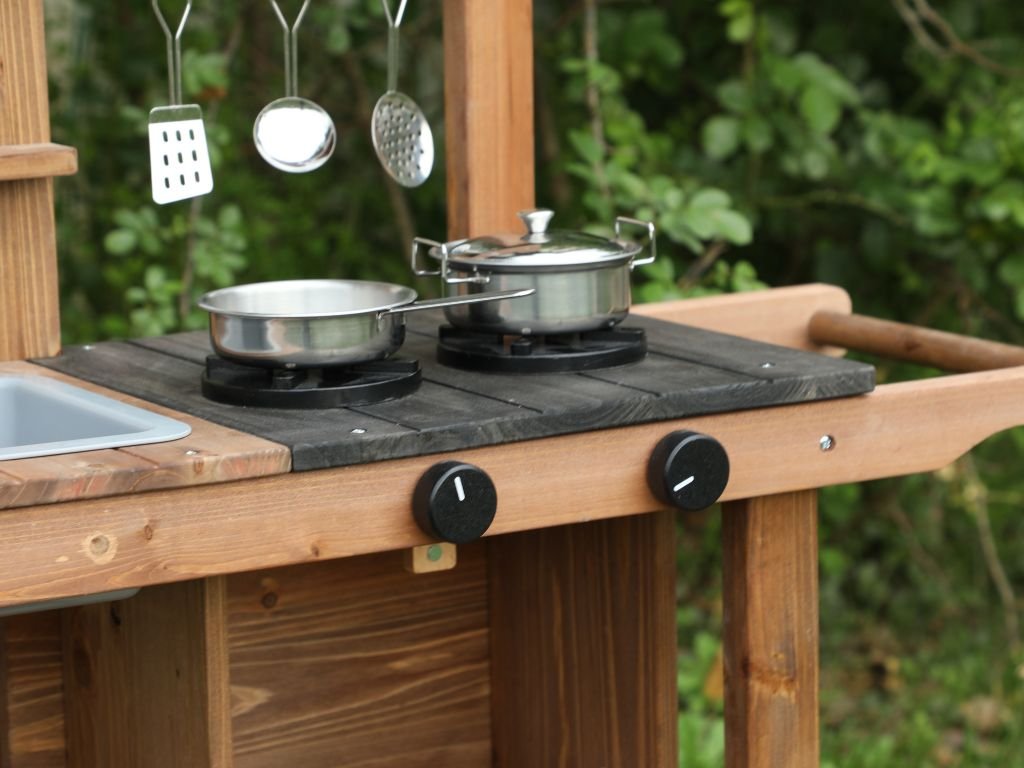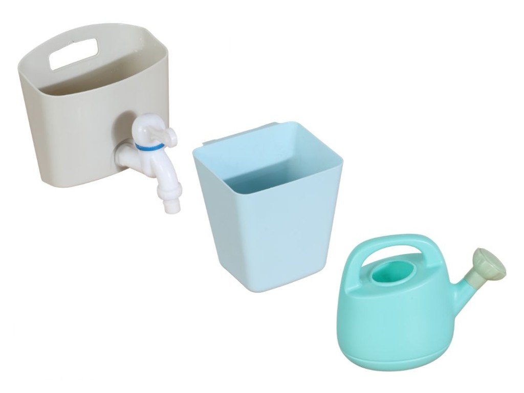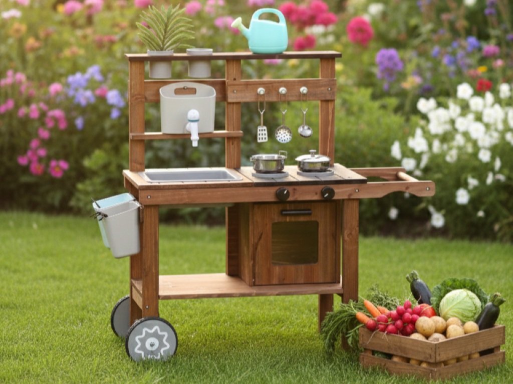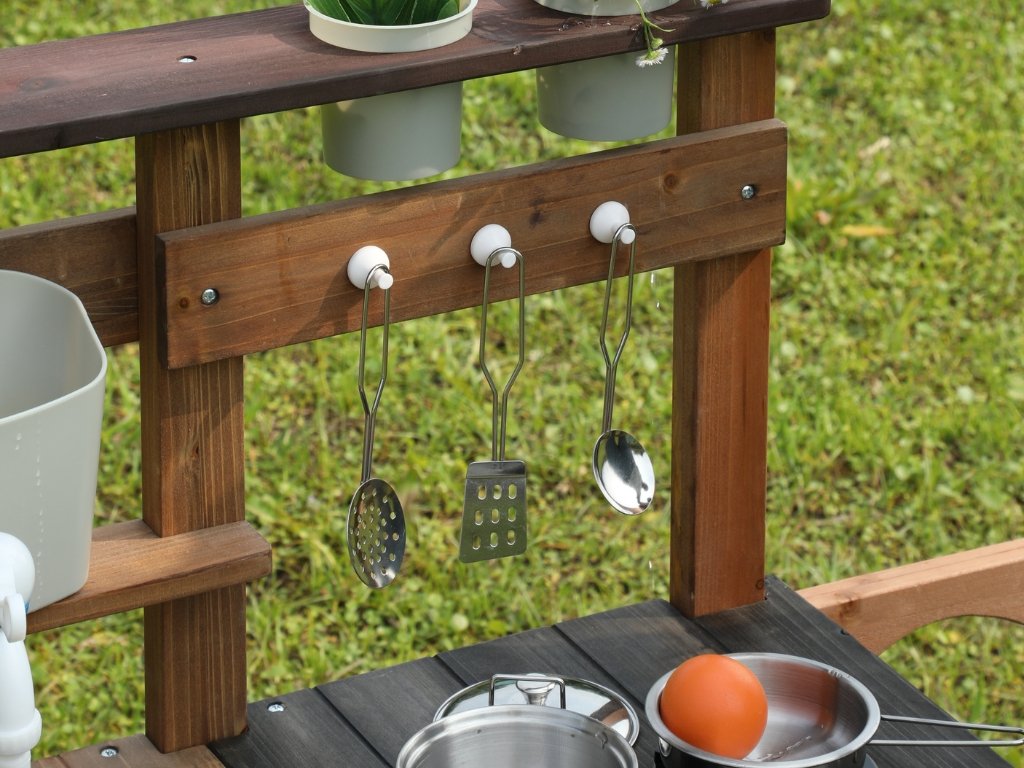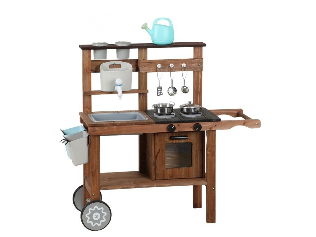 Snadno přemístitelná kuchyňka se dvěma koly je vybavena mnoha doplňky, jako jsou například hrnce, pánev a nádoba na vodu, díky nimž si děti mohou realisticky hrát na vaření i mytí nádobí. Součástí jsou také květináče a konvička, které přirozeně rozšiřují hru o péči o rostliny.