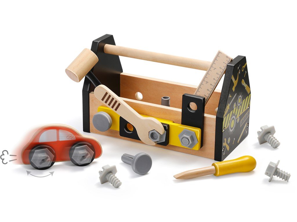 Sada dřevěného dětského nářadí v dřevěné bedně (boxu) je snadno přenosnou dřevěnou hračkou, se kterou si děti užijí spoustu zábavy a ještě zdokonalí své dovednosti. Bedna s dřevěným kladivem, šroubovákem, klíčem a metrem umožní dětem pustit se do kutění i oprav, šroubovat a spojovat různé destičky, které jsou součástí balení. Stylový box s nářadím, v kombinaci přírodního dřeva a černé barvy, zdokonaluje pomocí hry jemnou motoriku, koordinaci očí a rukou, manuální zručnost, podporuje dětskou fantazii a kreativitu, učí děti trpělivosti a soustředit se.
