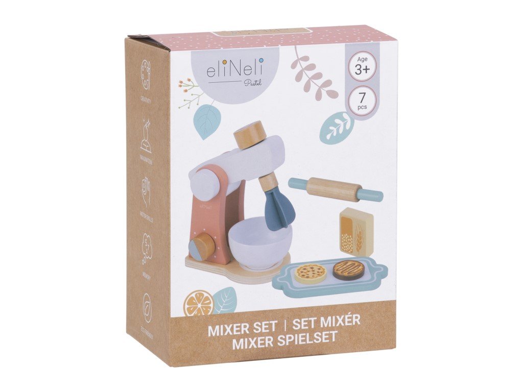 Dětský mixér v setu s příslušenstvím, vyrobený z kvalitního přírodního dřeva, nesmí chybět v žádné dětské kuchyňce. Pomocí kuchyňského robota děti upečou lahodné sušenky, které pak mohou servírovat na čajovém dýchánku nebo posezení u kávy, pořádaného pro oblíbené panenky, plyšáky nebo rodiče. Dřevěný mixér v krásných barvách je edukativní hračkou, která umožňuje dětem napodobovat dospělácké činnosti bezpečným dětským způsobem. Děti si vyzkouší práci s mixérem, válet těsto, upéct lahodné sušenky, které jsou součástí setu. Balení obsahuje dřevěný mixér i další dřevěné příslušenství - mísu, destičku (tác), váleček, mouku i 2 lahodně vypadající sušenky.