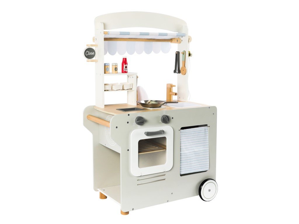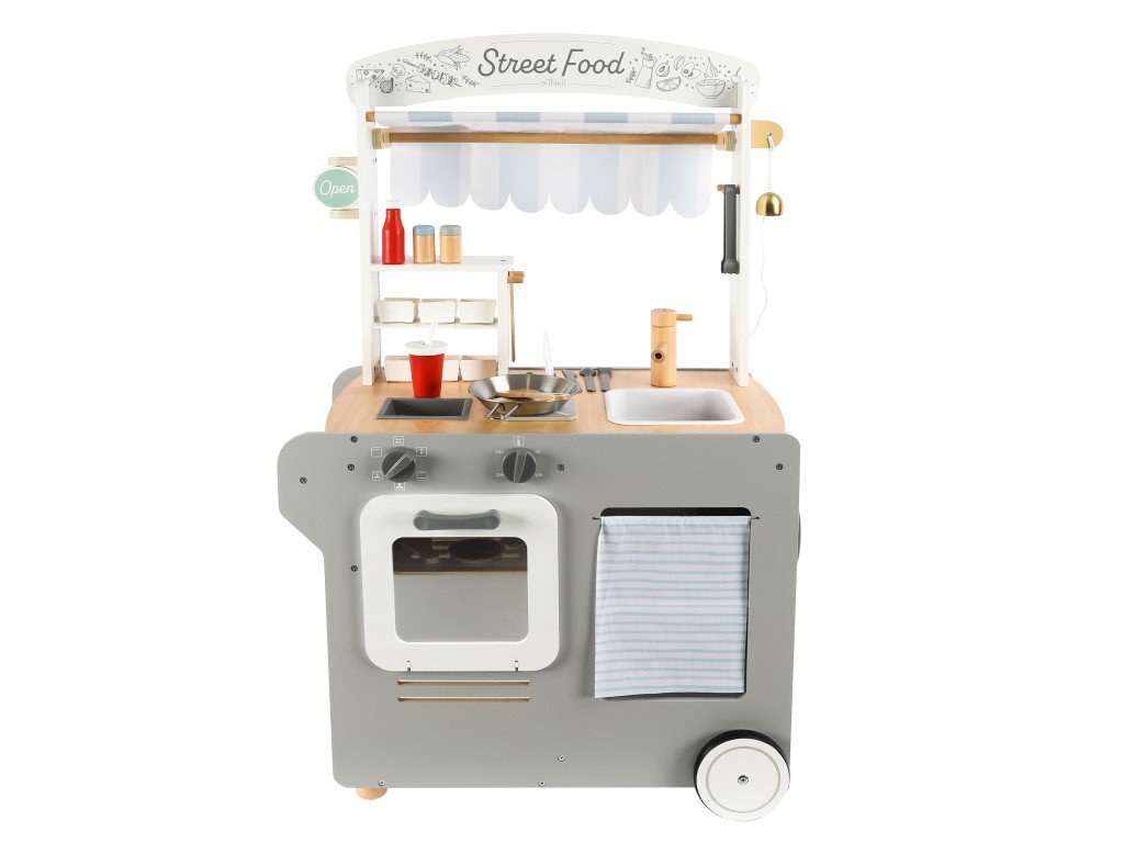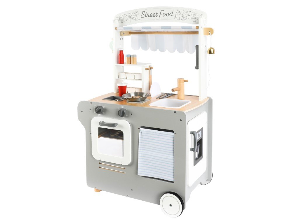 Dětský dřevěný obchůdek promění každé dítě v kuchaře a obchodníka. V pojízdné prodejně občerstvení totiž děti mohou vařit, péct a smažit různé dobroty, prodávat nápoje s ledem i zmrzlinu. Pro pohodlí hostů je součástí obchůdku malý stoleček v podobě pultu a stolička, aby nemuseli jíst ve stoje. Tato edukativní hračka umožní dětem vyzkoušet si profesi kuchaře a prodavače, vaření, smažení a pečení bezpečným dětským způsobem. Součástí obchůdku jsou základní spotřebiče - pečící trouba, sporák, vanička na smažení, ledovač, nechybí ani dřez na nádobí, úložné prostory, poličky, markýza, černá tabule pro denní nabídku, zvoneček a další vychytávky. Dětská prodejna je doplněna nádobím, kuchyňským náčiním, kořením i potravinami. Díky kolečkům je obchůdek mobilní, děti jej mohou otevřít kdekoliv ve vašem domě či bytě, snadno se přesouvá a snadno se s ním manipuluje. Při hře v dětské kuchyňce děti zdokonalují motorické dovednosti, koordinaci očí a rukou, manuální zručnost, rozvíjí svou fantazii a kreativitu, hrají role, budují sociální vazby.