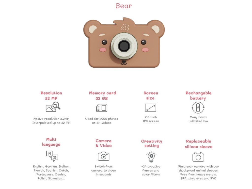 Silikonový kryt z ekologického materiálu bez PVC a ftalátů v podobě hnědého medvěda je nejen roztomilý, ale hlavně chrání fotoaparát 2v1 před pádem a udržuje ho čistý. Lze jej snadno sejmout a omýt. Díky vestavěné dobíjecí baterii zvládne fungovat několik hodin, než bude nutné nové nabití. Dětský digitální foťák s 2palcovým displejem může pořídit více než 2000 fotografií nebo nahrát přibližně 4 hodiny záznamu.