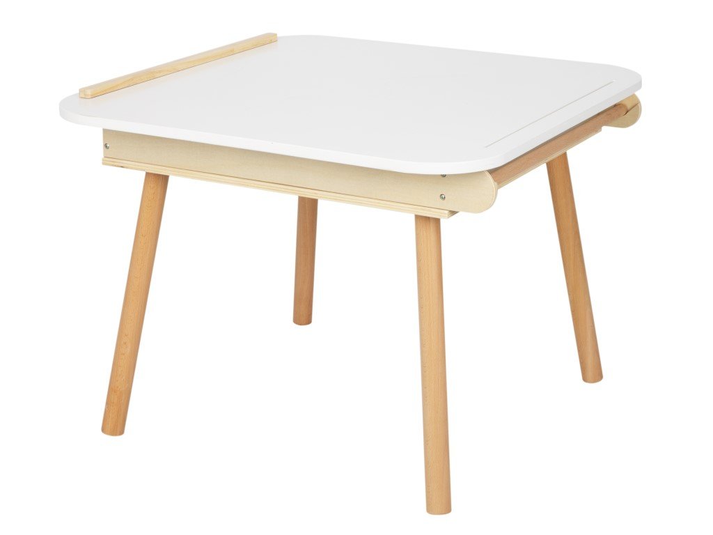 Díky neutrální barevné kombinaci přírodního dřeva s bílou barvou je set nábytku vhodný do každého interiéru. Stoleček i židle jsou vyrobené z kvalitních materiálů, bukového dřeva a kvalitní překližky. K nátěru se používají barvy a laky vhodné a bezpečné pro děti.