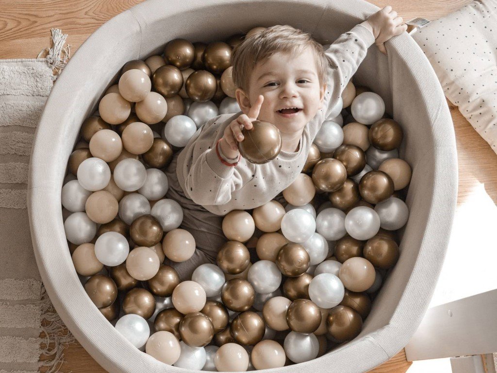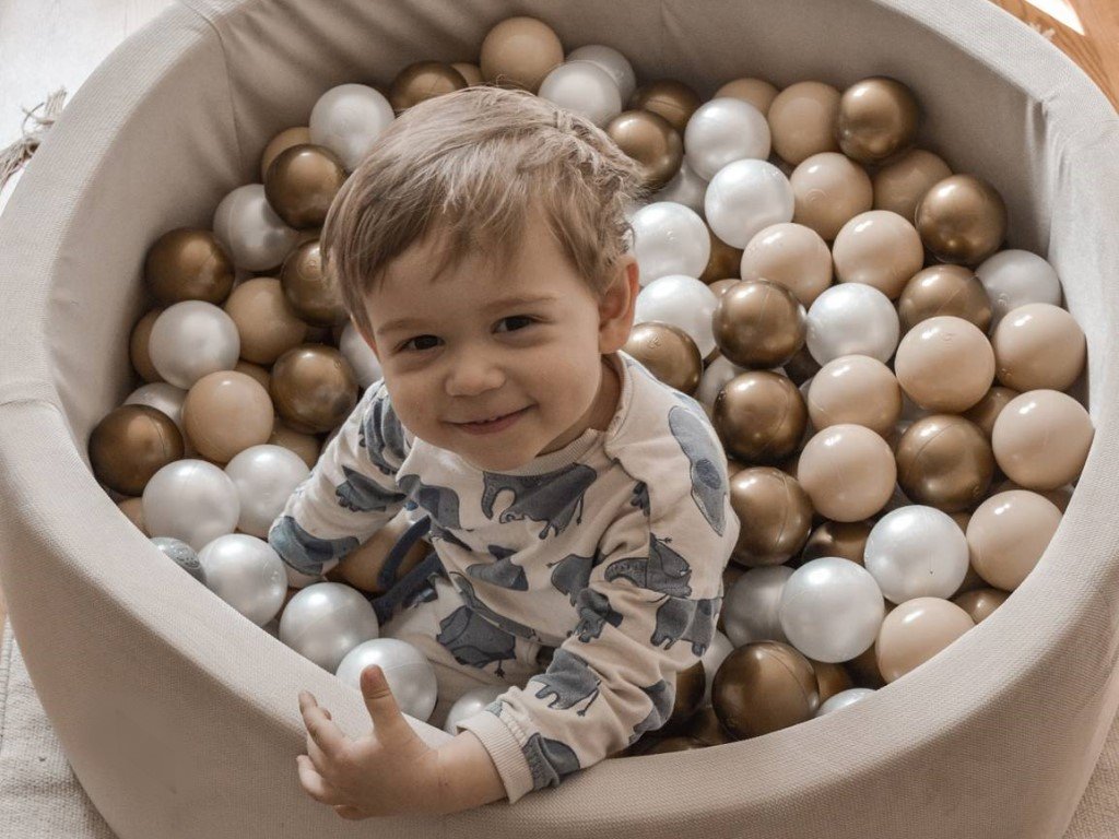 - Balení obsahuje: suchý bazén v béžové barvě a 200 ks míčků (kombinace 3 barev míčků).