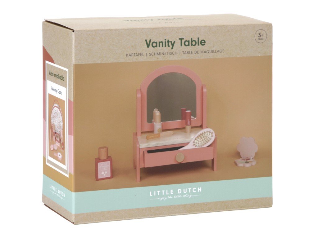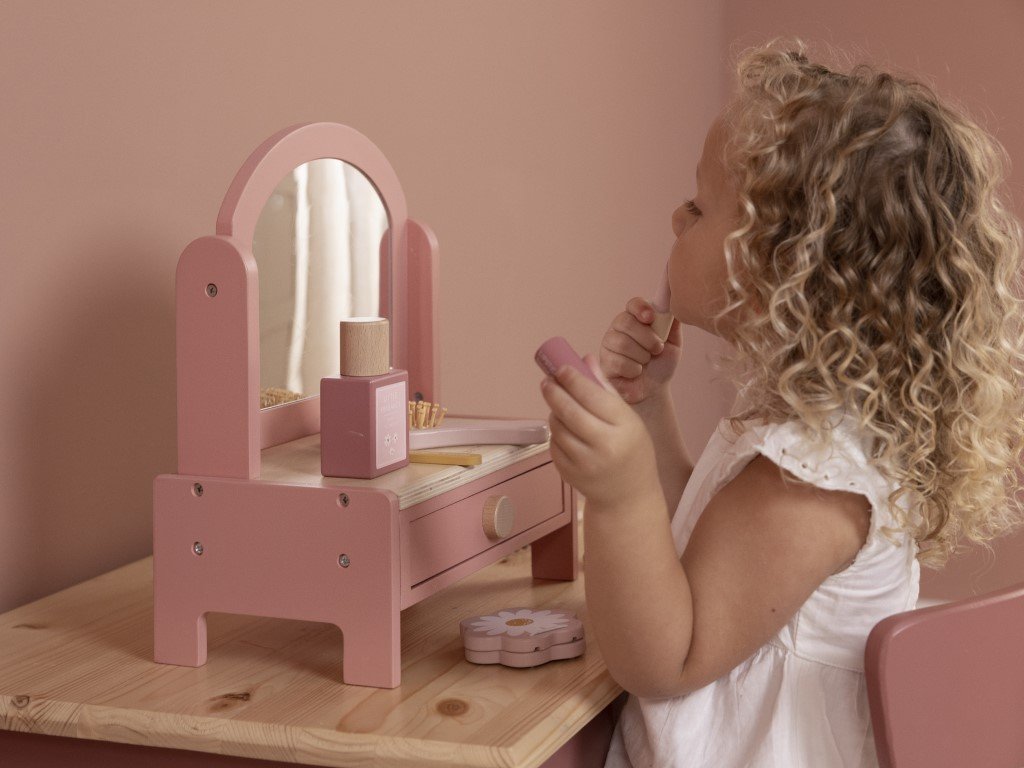 Součástí kosmetického stolečku je otočné zrcátko, které lze otáčet směrem dolů a nahoru. Lze jej nastavit tak, aby na sebe malá parádnice co nejlépe viděla. Toaletní stoleček navíc ukrývá velký šuplík, do kterého si vaše holčička pohodlně uklidí své šperky, hodinky, gumičky, sponky a ozdoby do vlasů, své poklady a jiné drobné předměty.
