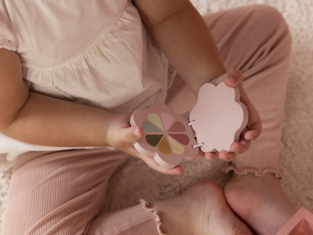 - Kombinace růžových pastelových barev a přírodního dřeva.