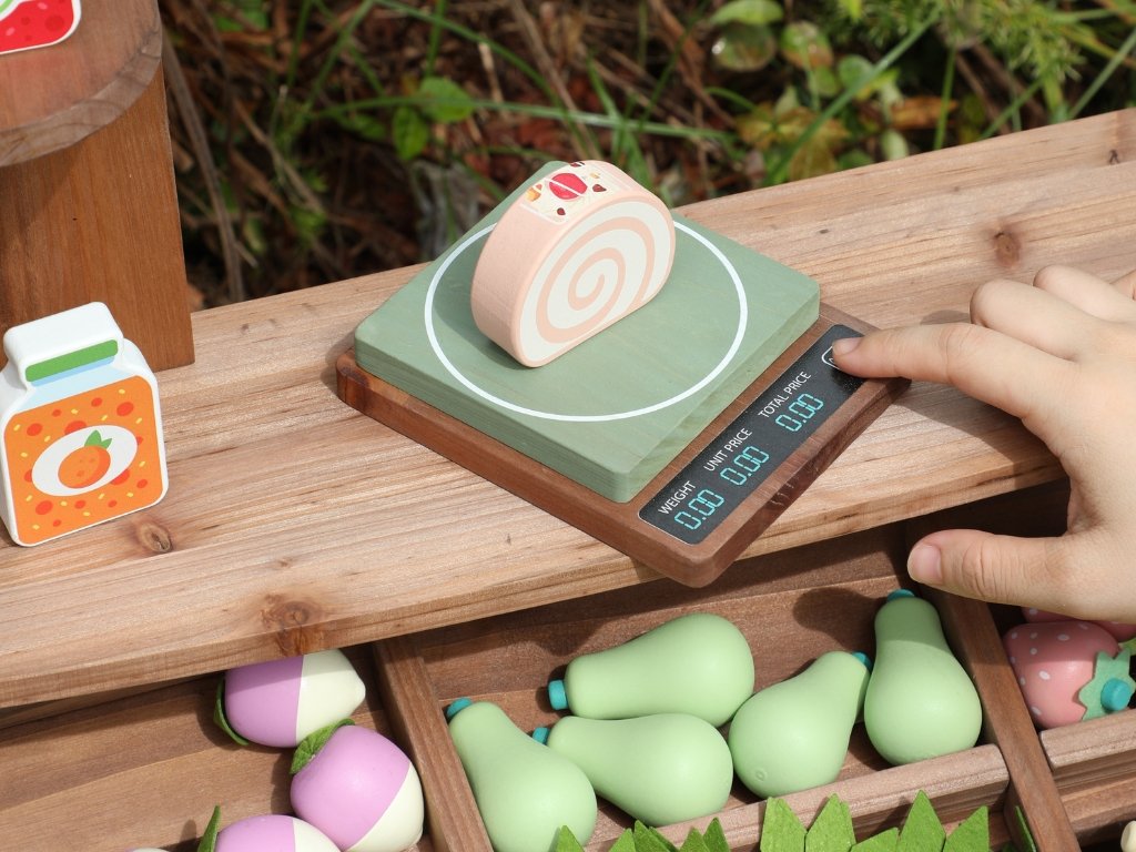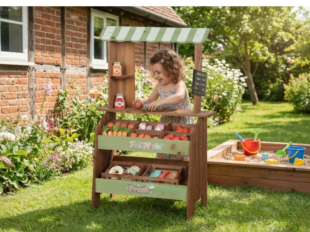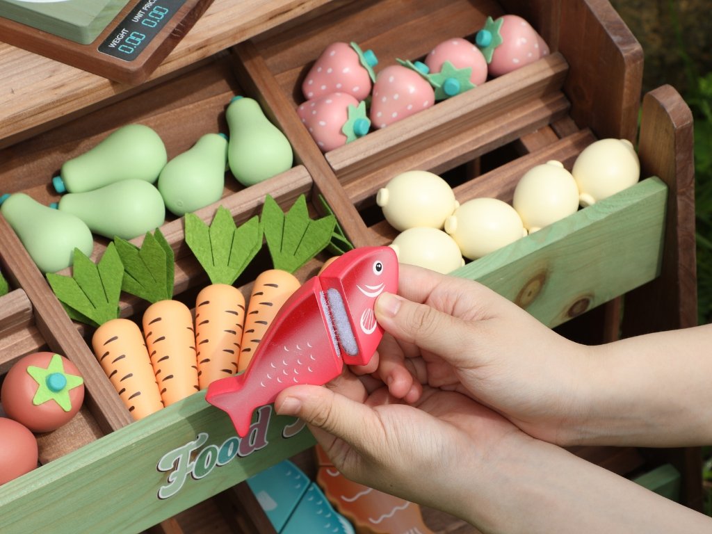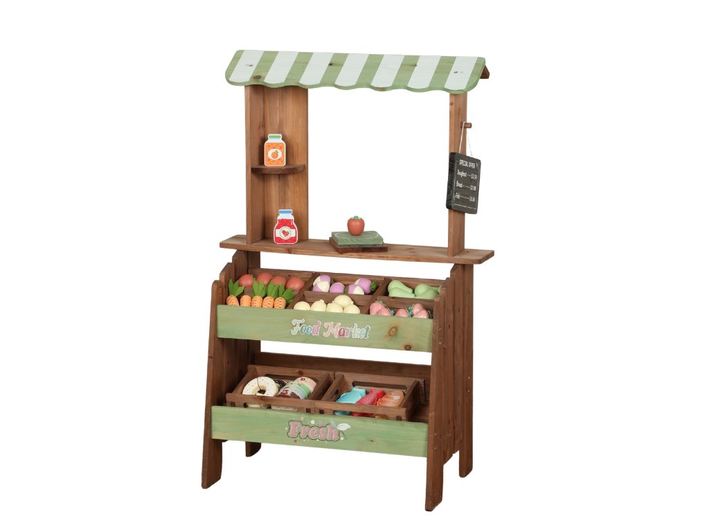 Masivní jedlové dřevo v kombinaci s MDF zajišťuje vysokou stabilitu, odolnost vůči venkovnímu používání a dlouhou životnost. Bohaté příslušenství včetně ovoce, zeleniny, zákusků, ryb, pečiva na suchý zip, váhy a cenovky umožňuje realistickou hru na obchod a rozšiřuje možnosti využití.