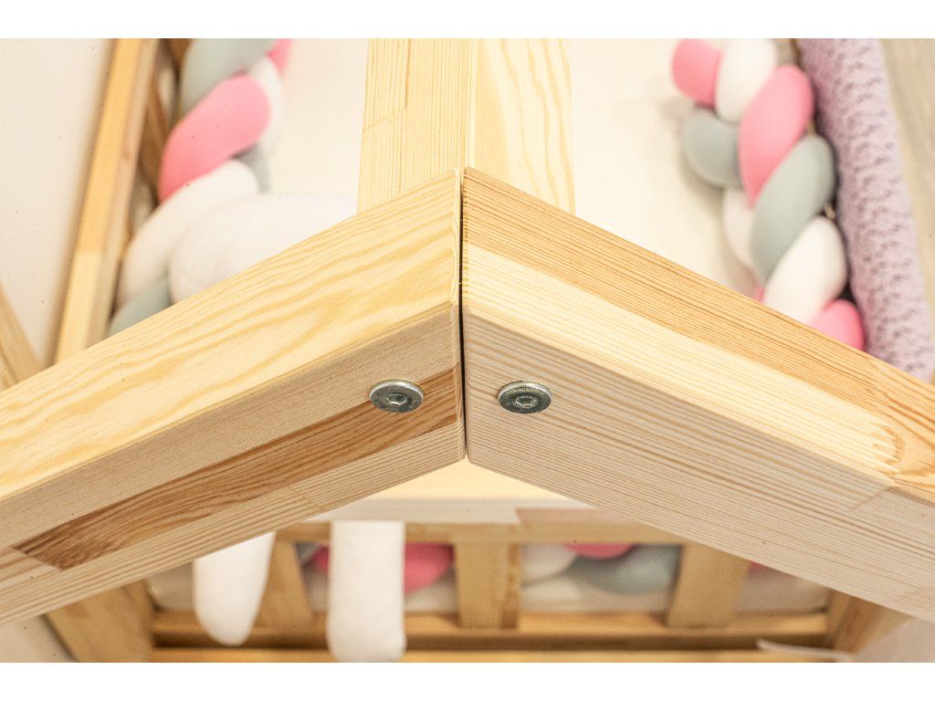 Domečkovou postýlku si můžete objednat bez nožiček (výška rámu od podlahy 1cm), nebo je možné dokoupit trámky s nožičkami (s vyšším navrtáním) a vznikne tak prostor pod postelí 20 cm. Celková výška postele je u obou variant shodná. Délka nohy ke zlomu je 99 cm.