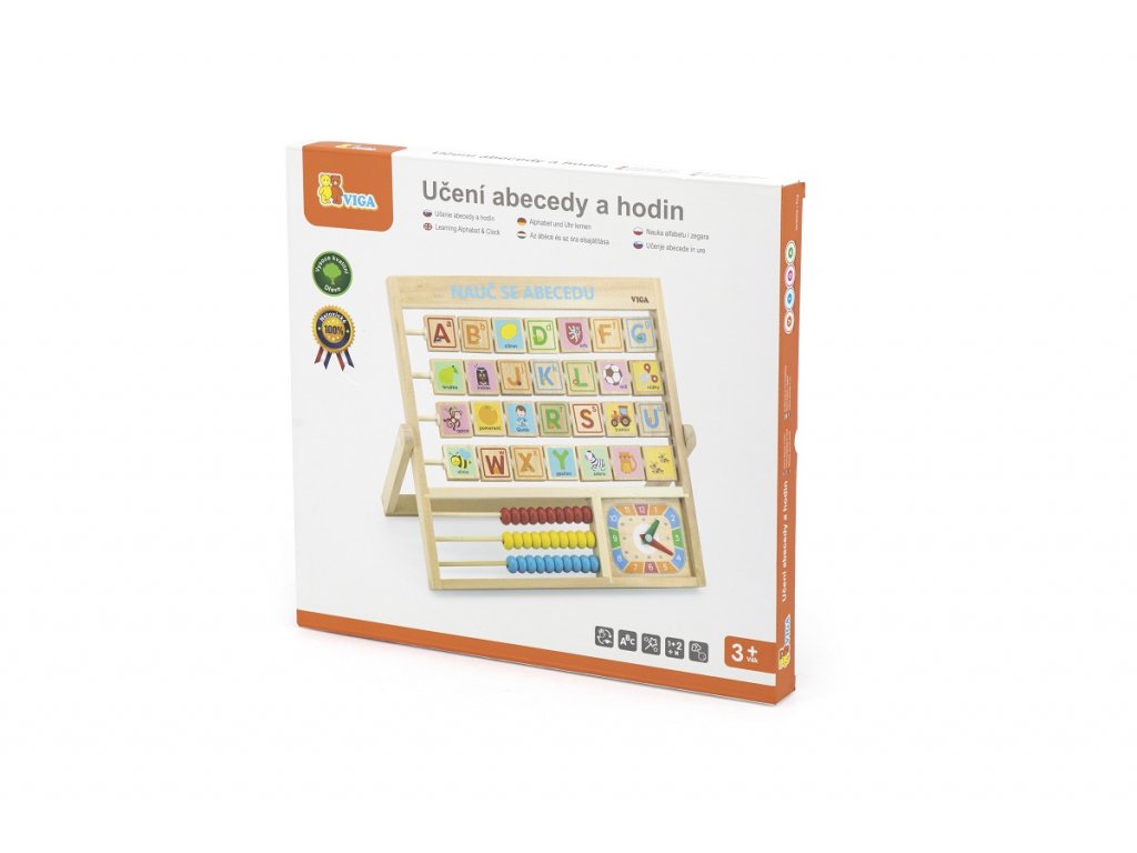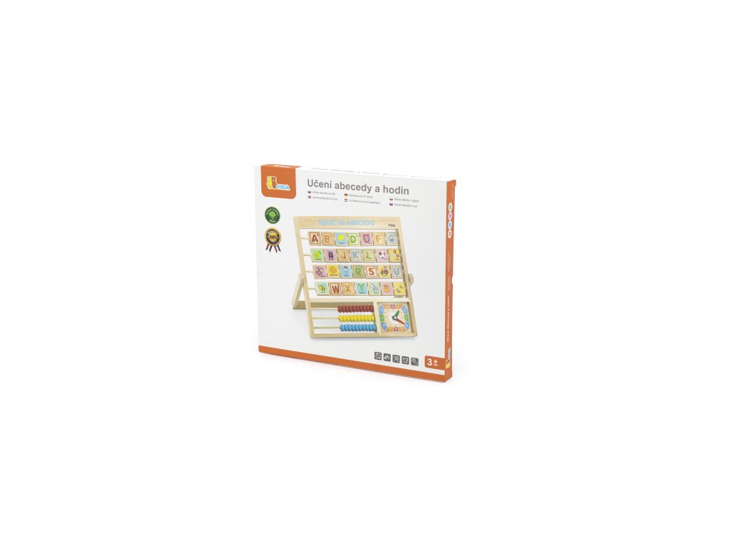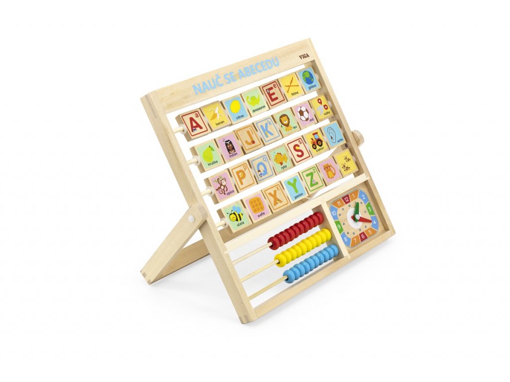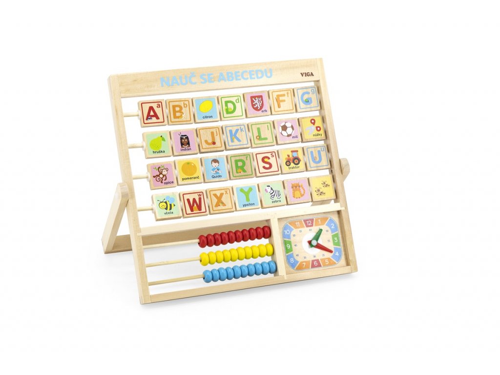 Barevná abeceda v praktickém rámu, který můžete položit nebo postavit na stůl, bude pro děti prvním pojítkem se školní docházkou. Můžete společně zkoušet trénovat písmenka, která mají z druhé strany obrázky pro snadnější zapamatování a také hodiny a první počty na počítadle. Učící tabulka bude i pěkným doplňkem na poličce či stole v dětském pokojíčku.