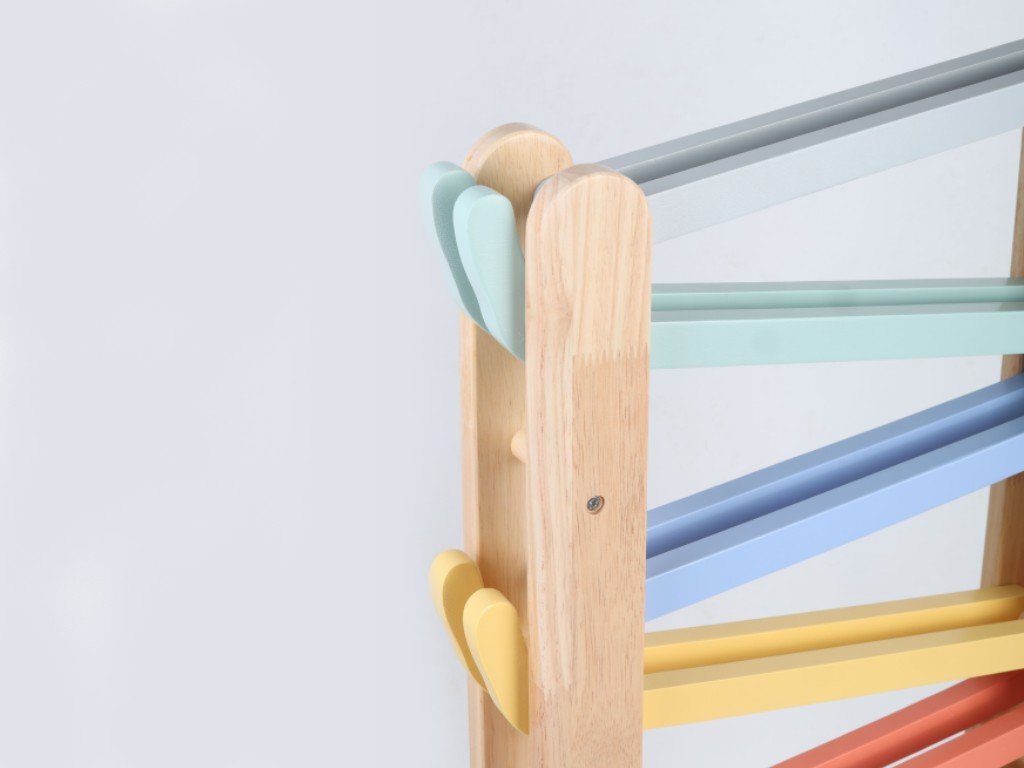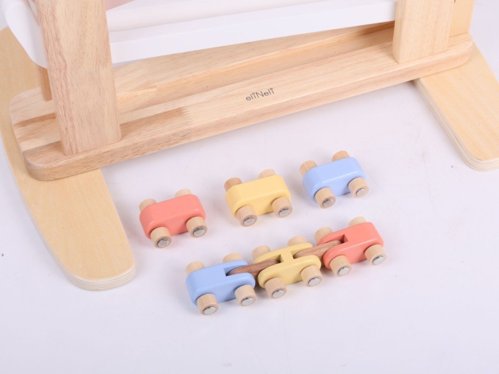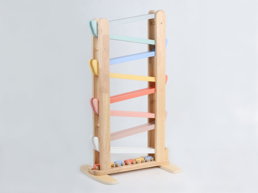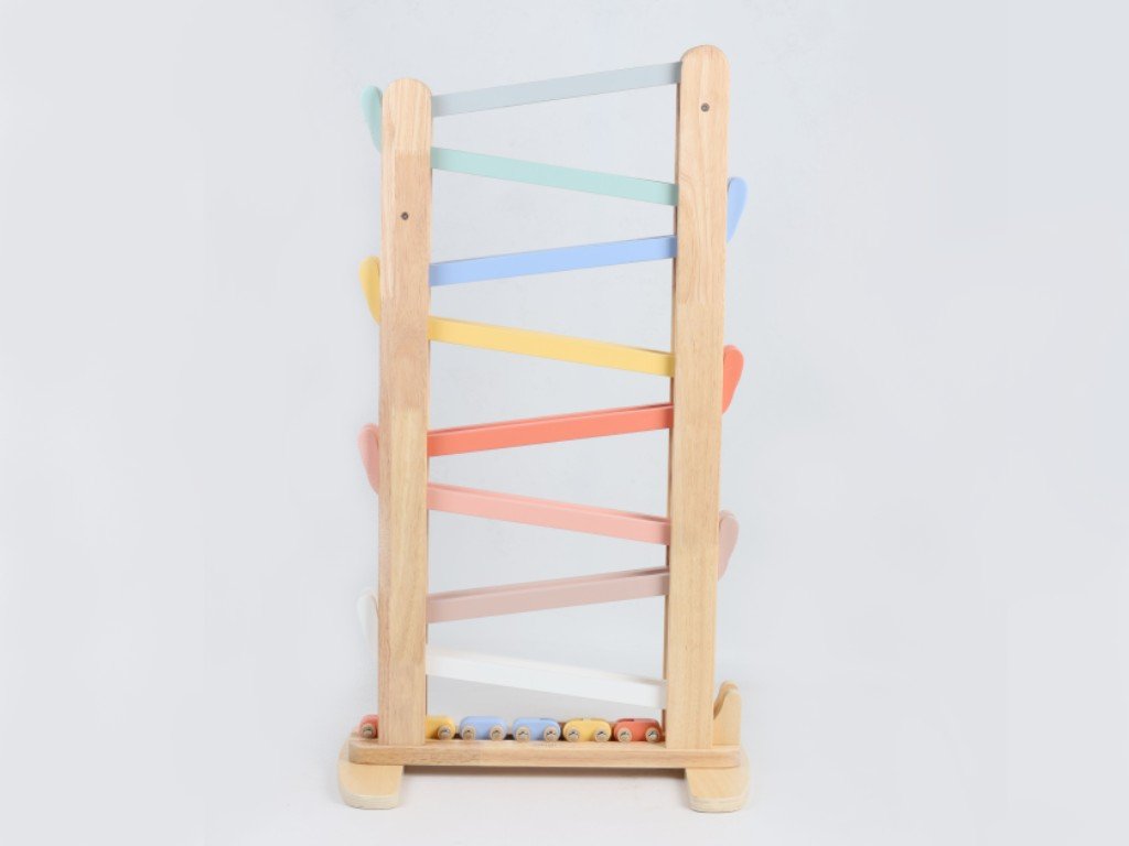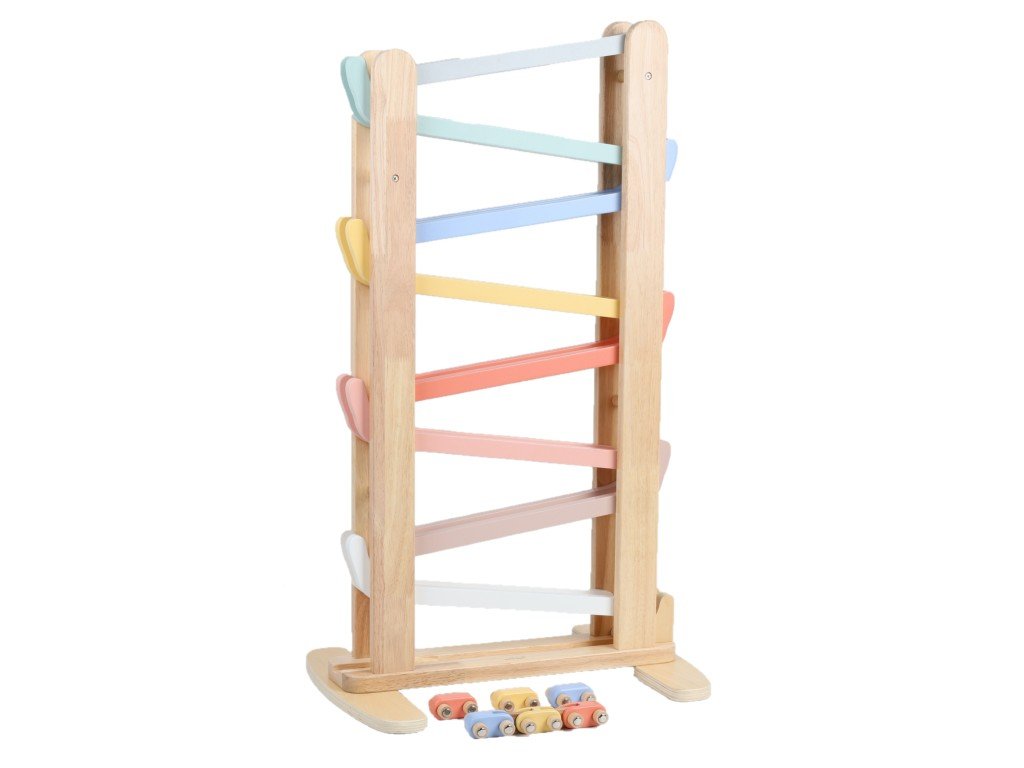 Dřevěná autodráha v XXL verzi nadchne malé závodníky extra výškou i pastelovými barvami, které vkusně doladí každý dětský pokojíček. Závodní dráha s barevnými skluznicemi přináší spoustu herních variant. Děti mohou nechat jednotlivá autíčka volně a plynule sjíždět dolů, nasadit na dráhu spojenou soupravu se 3 vozy, jako mini vláček či autobus, nebo uspořádat pro auta závody. Stačí správně položit jedno ze závodních autíček na začátek závodní dráhy a sledovat, s jakou rychlostí překoná všechna nižší patra, až dorazí do úplného cíle.
