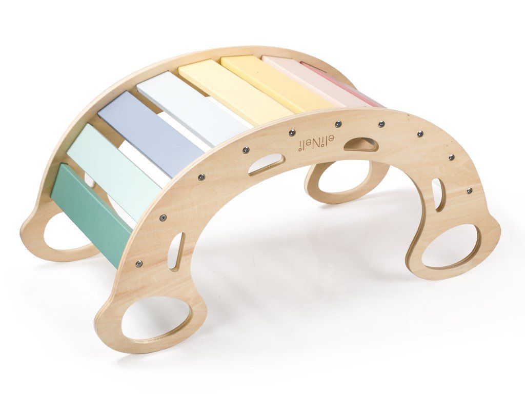 Dřevěná montessori houpačka 5v1, v barevné kombinaci přírodního dřeva a jemných pastelových barev, je multifunkční hračkou do dětského pokoje, kterou děti využijí nejen při pohybových hrách. Na pastelové houpačce se mohou děti houpat nebo jen příjemně relaxovat za mírného pohupování. Pro maximální pohodlí doplňte houpačku měkkým potahem. Houpačka skvěle poslouží jako prolézačka, skluzavka do interiéru. Děti ji mohou přelézat, podlézat, schovat se pod ni, klouzat se po ní, posadit se na ni nebo si lehnout. Při dětských hrách může být mostem, tunelem, domečkem i prodejním pultem. S dřevěnou houpačku si děti užijí spoustu legrace, rozhýbou celé tělo, posílí svaly, zdokonalí své motorické schopnosti.