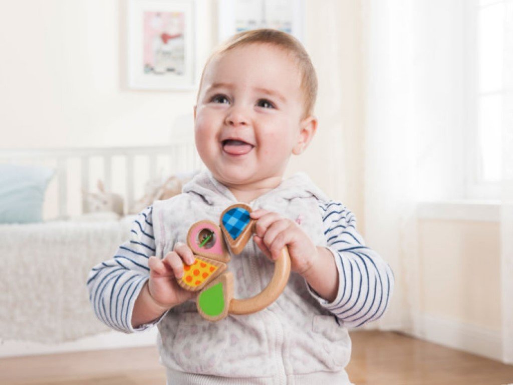 Jestliže patříte k rodičům, kteří chtějí pro své děti hračky z kvalitních přírodních materiálů, jako je bukové dřevo, pak zcela správně vybíráte toto dětské chrastítko, kousátko. Jeho oblý tvar a velikost jsou zcela uzpůsobeny malým ručičkám od 6 měsíců a jemné veselé barvy děti zaručeně zaujmou. Ještě oblíbenějším se štěrchátko stane ve chvíli, kdy miminko zjistí, že jedna kapka obsahuje zrcátko, které mu společně s rolničkou propůjčí ještě větší atraktivitu. S kroužkem si děti procvičí jemnou motoriku ručiček, která je pro jejich další vývoj tolik důležitá.