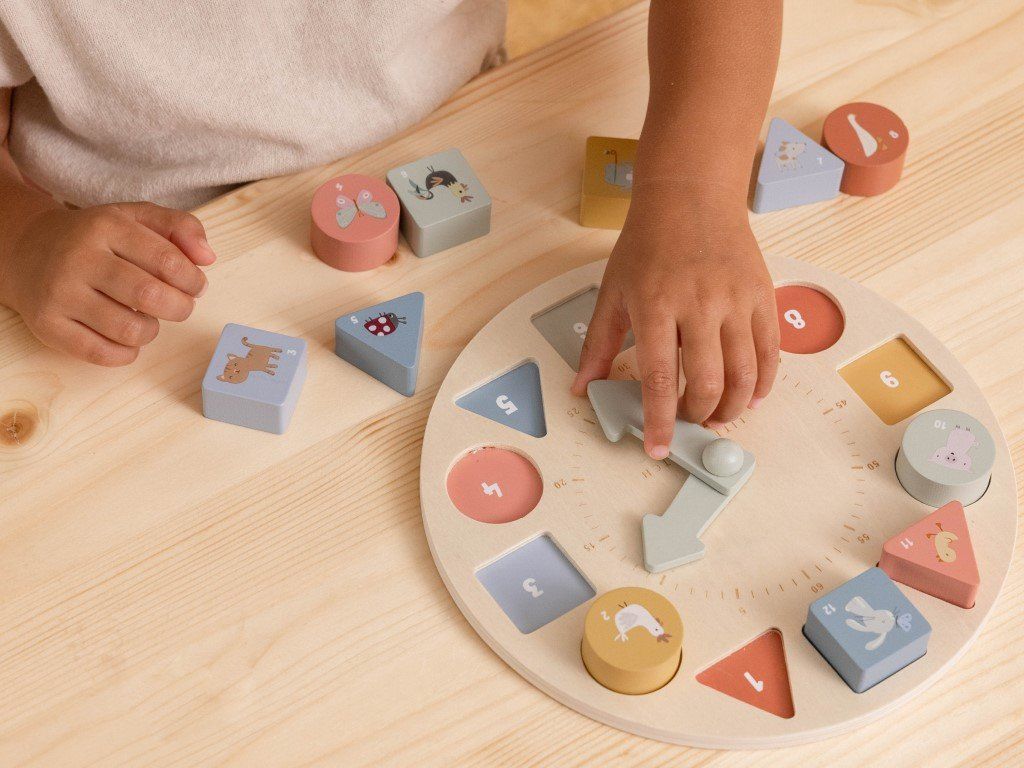 - Procvičí motorické dovednosti, koordinaci očí a rukou - pod vkládacími tvary se zvířátky se skrývají číslice ciferníku. Do otvorů v hodinách lze vložit pouze správný tvar, což vyžaduje někdy trochu soustředění a trpělivosti.