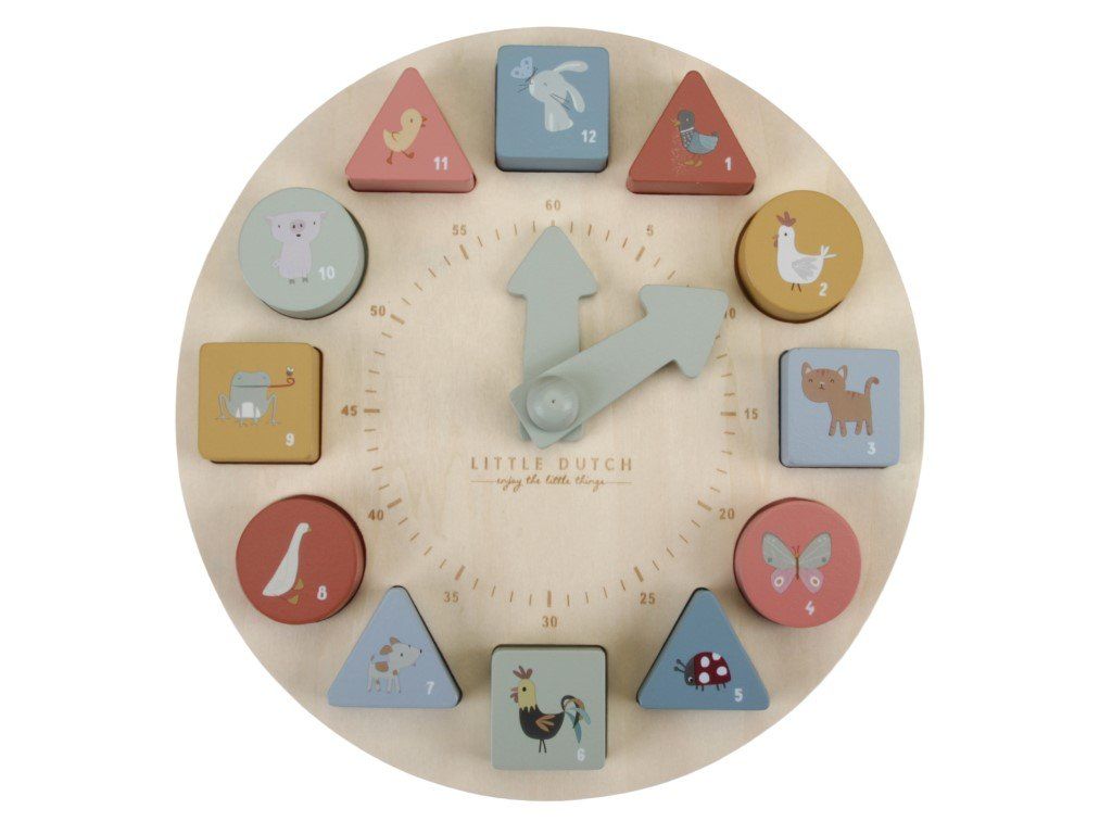 Dřevěného hodiny pro děti jsou zábavnou hračkou i vzdělávací pomůckou. Kvalitní hodiny v barvě přírodního dřeva, v kombinaci s příjemnými pastelovými barvami, naučí děti pomocí hry nejen poznávat čas, ale i rozpoznat tvary, čísla, barvičky, zvířátka, která běžně potkají venku na ulici, v přírodě i na venkově. Tyto hodiny však nejsou jen tak obyčejné. Jsou to hodiny 2v1, vzdělávací hračka a zároveň vkládací puzzle s tvary. Pro více zábavy jsou v hodinách předpřipravené otvory ve tvaru koleček, trojúhelníků a čtverců, tvořící ciferník hodin, které slouží k vkládaní geometrických tvarů s čísly a zvířátky. Při troše soustředění a trpělivosti se menším dětem jistě podaří umístit správný tvar do správného otvoru. Pro větší obtížnost jsou i zvířátka očíslovaná.