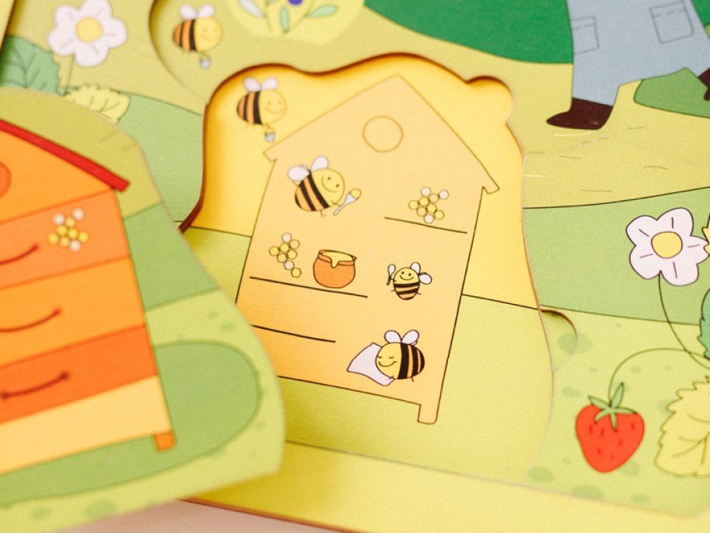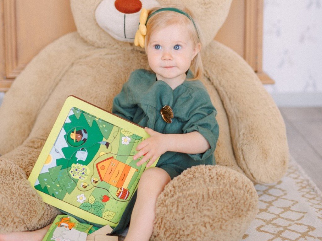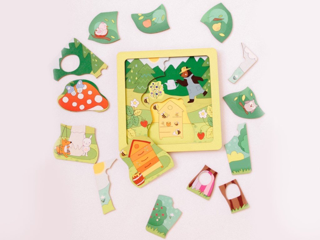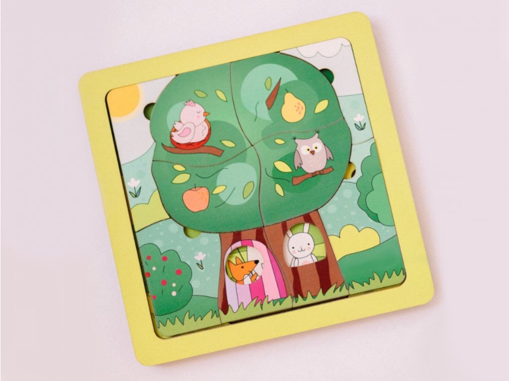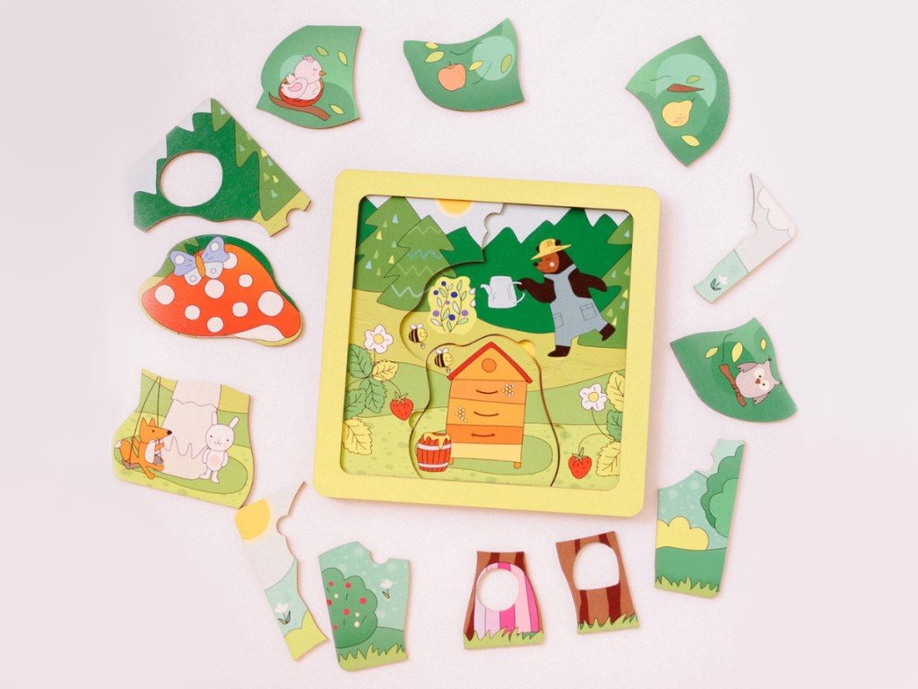 Dětské dřevěné puzzle zavede děti do lesní říše, kde se seznámí s medvídkem, zajíčkem a liškou. S těmito zvířecími kamarády se děti vydají za lesním dobrodružstvím, která ukrývají jednotlivé vrstvy dřevěného puzzle. Při skládání puzzle děti zdokonalují své dovednosti, trénují mysl, jemnou motoriku, koordinaci očí a rukou, logické myšlení, fantazii, učí se trpělivosti a soustředit se.