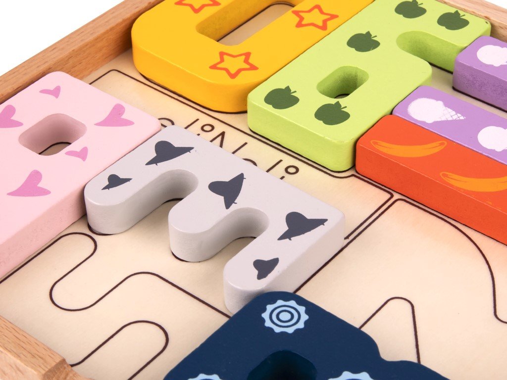 Dětské dřevěné puzzle není jen obyčejné puzzle, kdy děti na stole skládají jednotlivé puzzle díly do sebe. Každý dřevěný dílek puzzle je číslicí od 0 do 9, čekající, až ji děti správně vloží do dřevěného rámečku. Přestože to zní jednoduše, děti skládání puzzle může trochu potrápit. Pokud neumístí barevnou číslici správně, všechny se do dřevěného domečku (rámečku) nevejdou. Při hře si děti potrénují nejen motorické dovednosti a koordinaci očí a rukou, ale i trpělivost. Pro zjednodušení celé hry jsou na hrací desce namalované obrysy číslic. Pokud máte doma už většího šikulu, můžete obrysy zakrýt neprůhledným papírem a hru s puzzle svému dítku ztížit.