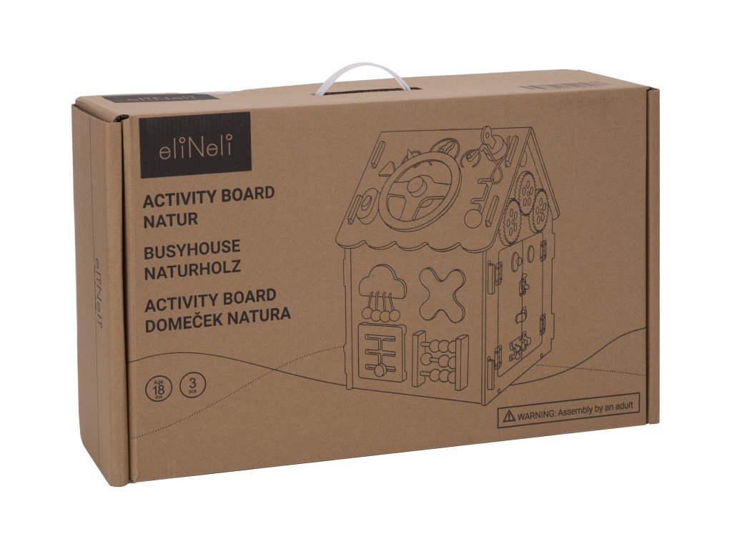 Dřevěný domeček activity board je hračkou i vzdělávací pomůckou v jednom. Díky hracím i montessori prvkům děti zabaví, zdokonalí jemnou motoriku, koordinaci očí a rukou, logické myšlení, manuální zručnost, naučí děti novým dovednostem, které zcela jistě využijí v praktickém životě. Hra s domečkem podporuje dětskou fantazii, kreativitu, stimuluje smysly, učí děti trpělivosti a soustředit se.