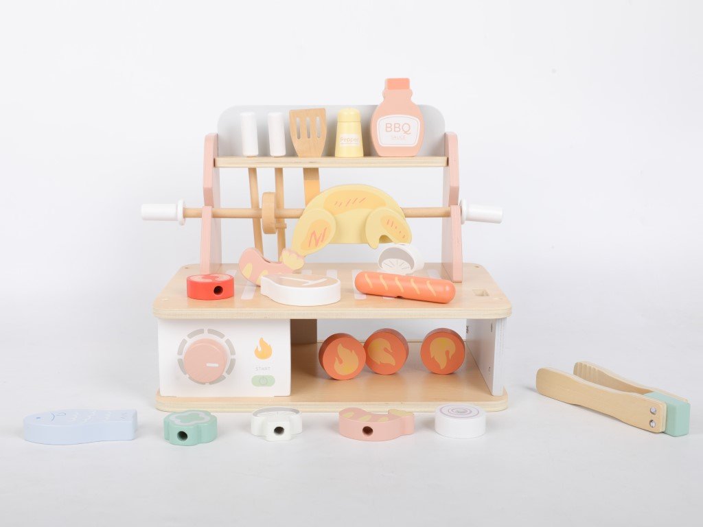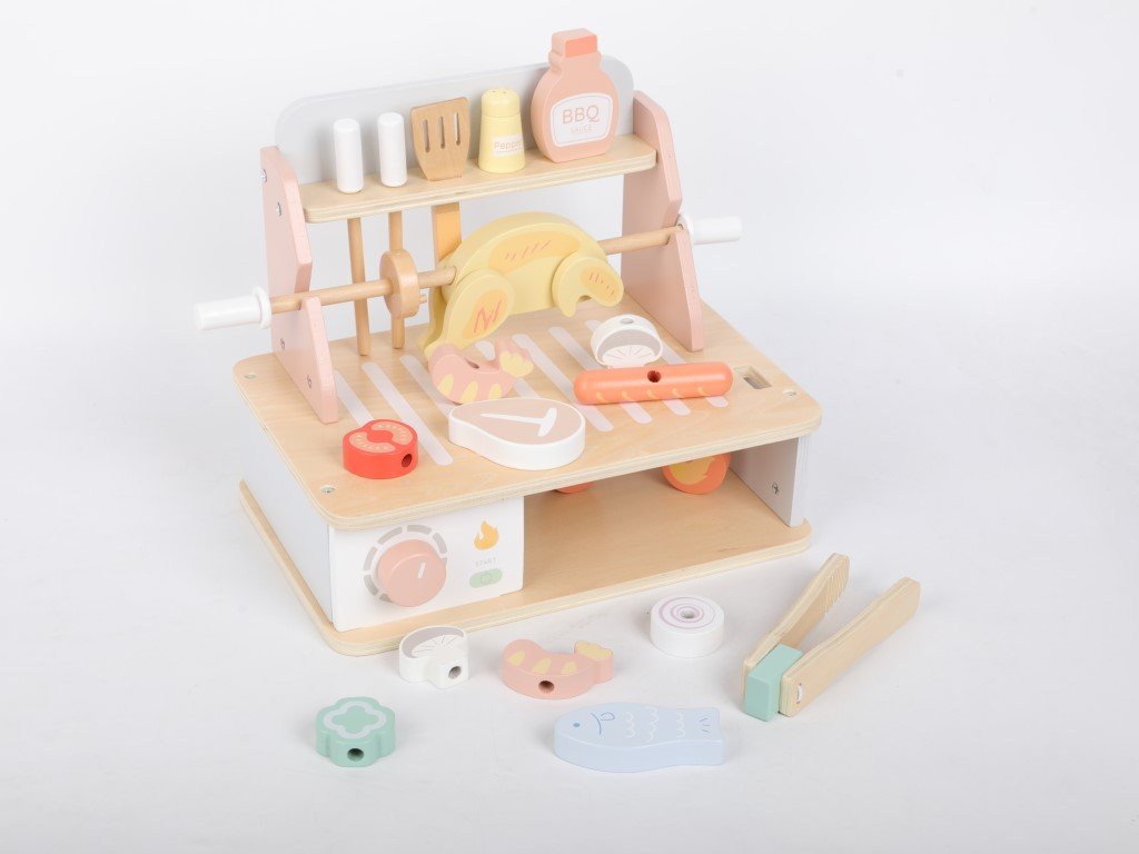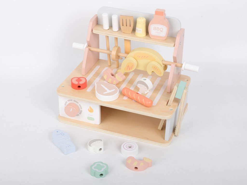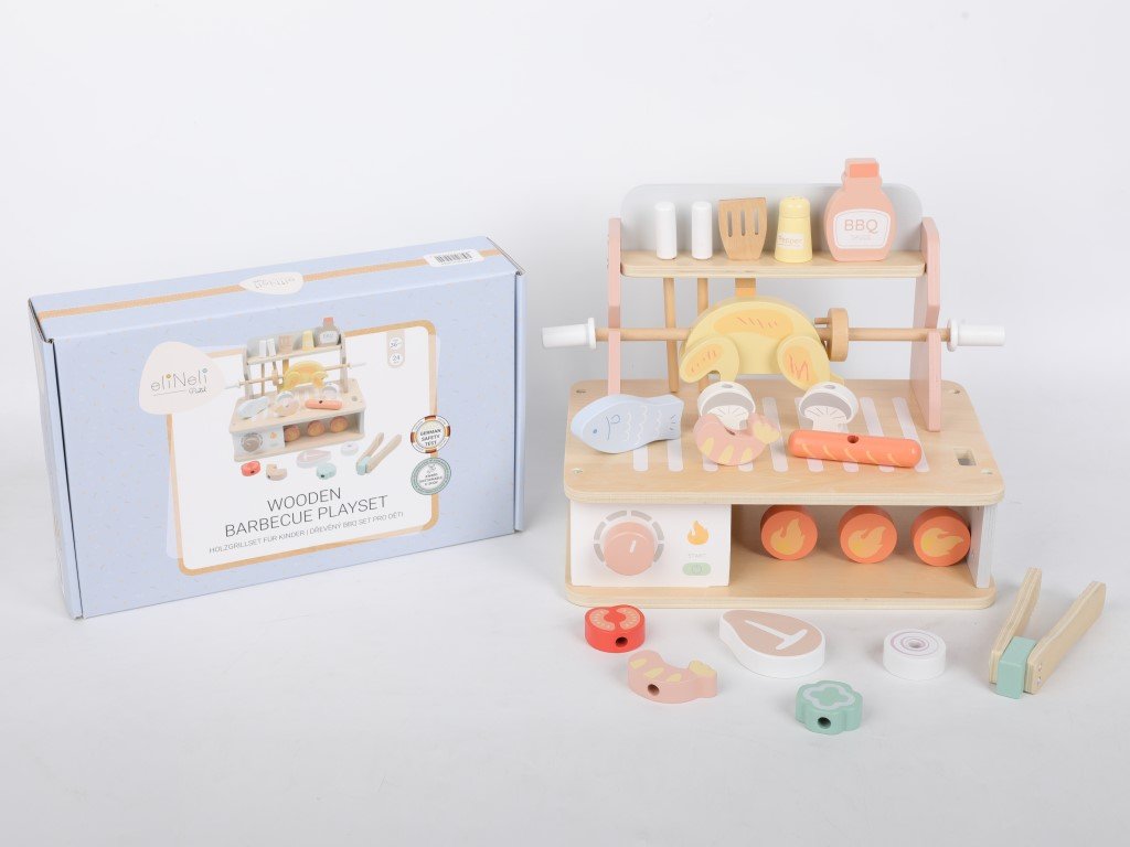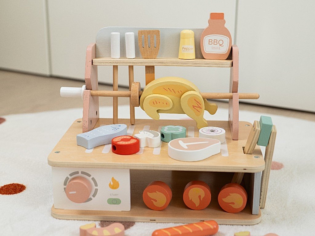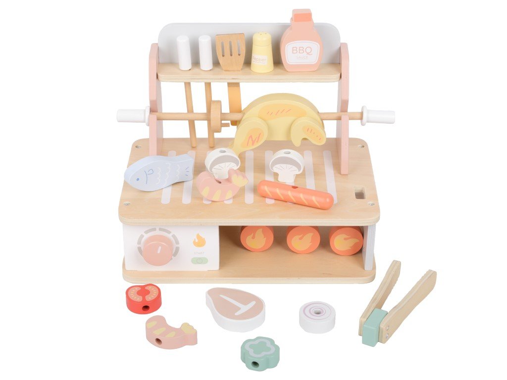 Dřevěný gril s bohatým příslušenstvím umožní dětem grilovat a pořádat Barbecue slavnosti po celý rok, za každého počasí, klidně i v dětském pokoji. Přestože jsou součástí grilu plamínky, nemusíte mít z hračky žádné obavy, tento ohýnek je dřevěný a nepálí. Různé druhy masa a potravin mohou děti připravovat více způsoby - grilovat na roštu, opékat nebo připravit špízy. Fantazii se meze nekladou a možná vás váš malý kuchtík překvapí, jak kreativní umí být. Součástí grilu je i různé grilovací náčiní a dochucovadla. Při hře s dřevěným grilem si děti vyzkouší grilování bezpečným způsobem, zdokonalí motorické dovednosti, manuální zručnost, rozvíjí fantazii a kreativitu, komunikační dovednosti, hrají role.