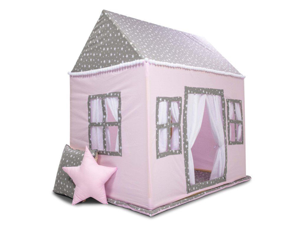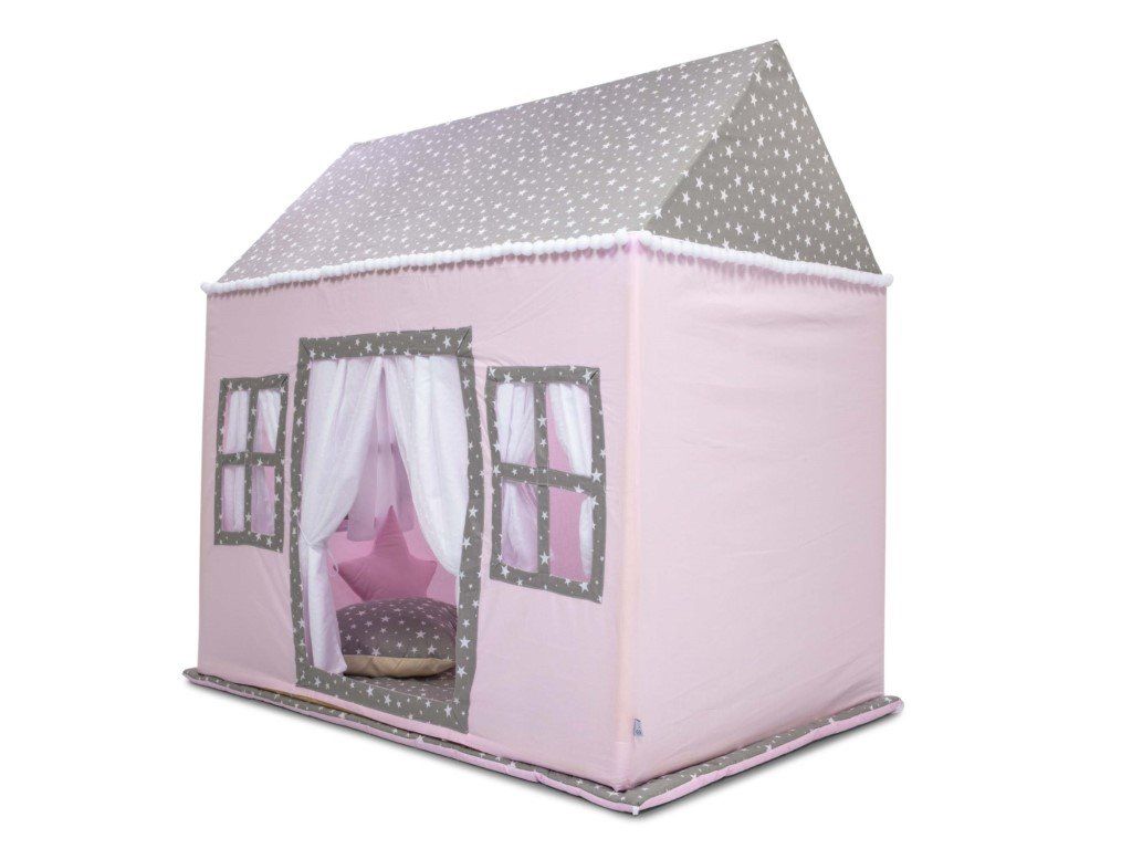 Hrací domeček v jemné růžové barvě, s šedou střechou s bílými hvězdami a bambulkami, je vhodný pro holčičky. Díky jemným barvám jej snadno sladíte s ostatním vybavením v království malé princezny.