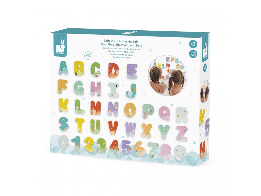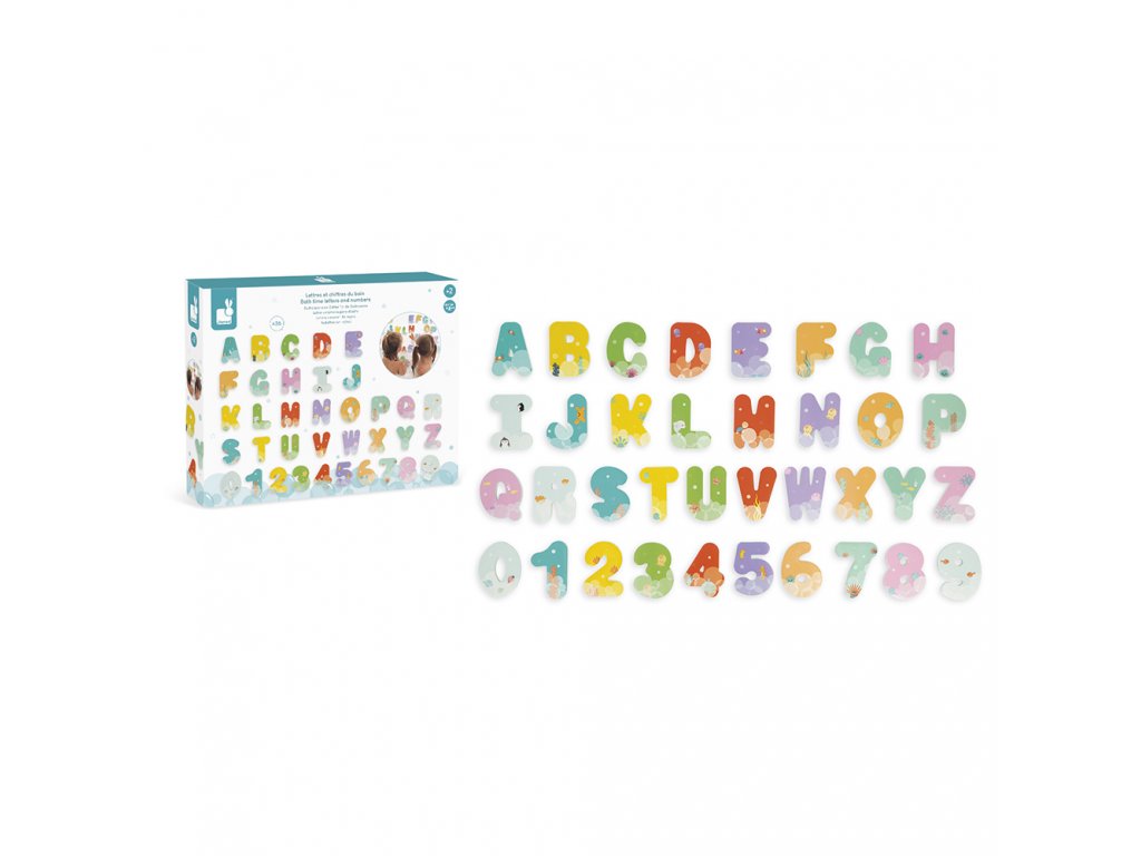 Sada obsahuje 36 velkých dílků v různých barvách (26 písmen A-Z a 10 číslic 0-9). Jsou vyrobeny z pěny, a tak drží na všech hladkých površích: dlaždicích, vaně i zrcadle. Hračka je vhodná pro hru na suchu i ve vodě. Každodenní povinná večerní koupel bude plná zábavy a potěšení nejen pro dítě, ale i pro rodiče. Ve vaně si děti mohou zahrát různé hry, zatímco čas koupání zaručeně rychle uteče.
