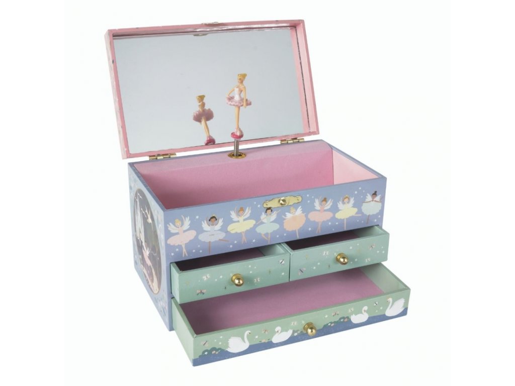 Kouzelná šperkovnice je pokryta krásnými ilustracemi baletek, labutí a dalších zvířat.Tři praktické zásuvky jsou ideální pro uložení cenných drobností.