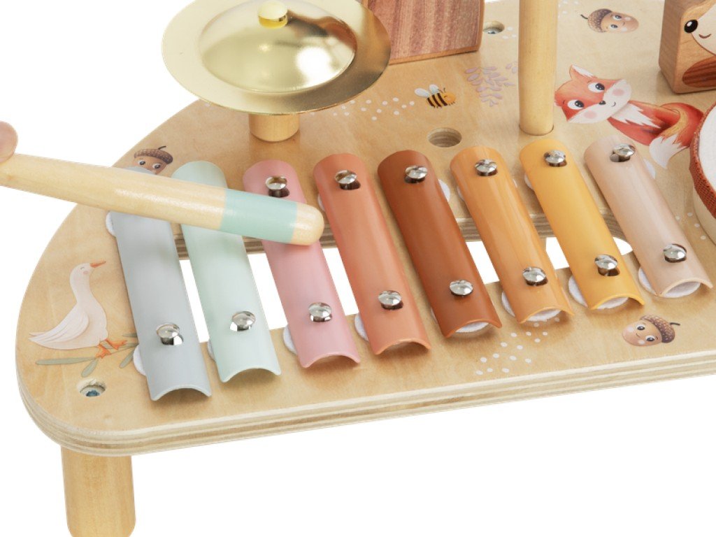 Hudební stolek se sadou hudebních nástrojů okouzlí každou holčičku i chlapce svým designem, barvami i motivem roztomilých zvířátek. Originální hudební stoleček probudí lásku k hudbě v každém dítku. Stoleček s hudebními nástroji přinese radost do každého dětského pokoje a hned tak děti neomrzí - hrát totiž mohou hned na několik hudebních nástrojů. Najdou tu xylofon, činel, bubínek, triangl nebo dřívka (paličky). Oblíbené hudební nástroje na jednom místě umožní dětem uspořádat malý koncert pro své panenky, plyšáky, rodiče nebo kamarády. Děti se seznámí s hudebními nástroji, s tím, jak se na ně hraje a jaké zvuky vydávají, stimulují své smysly, zdokonalují jemnou motoriku, hrají role, rozvíjejí fantazii.