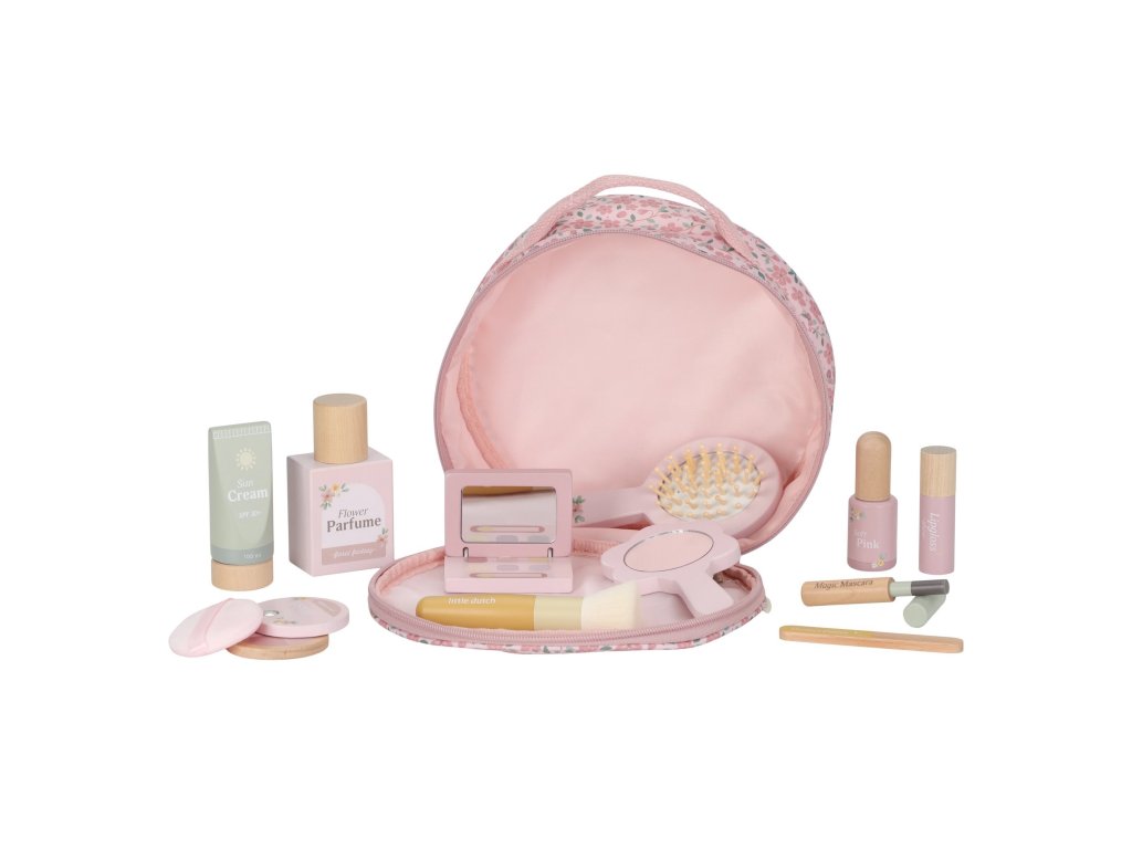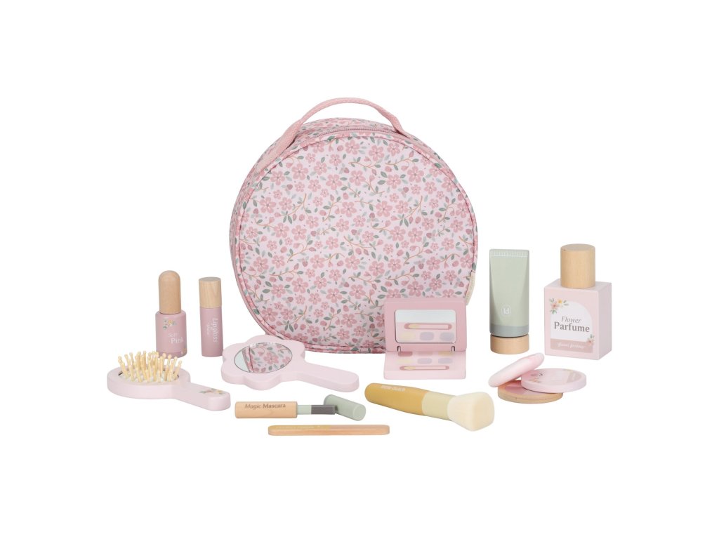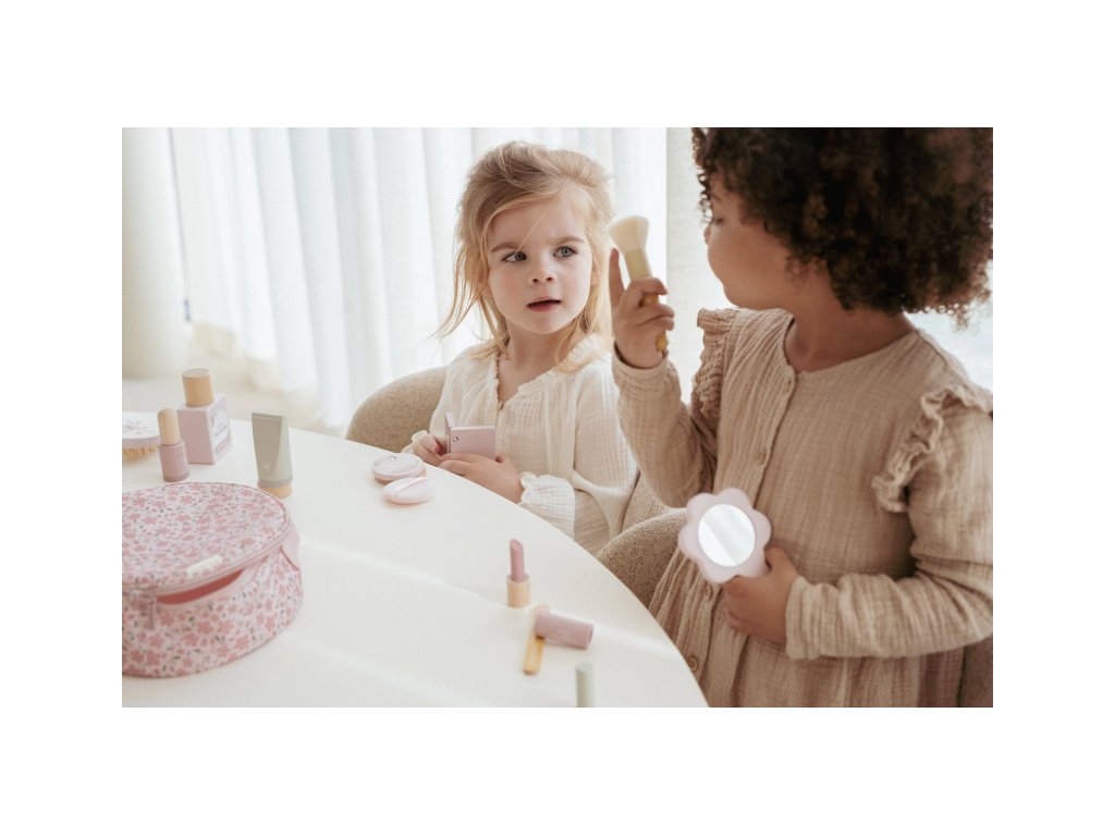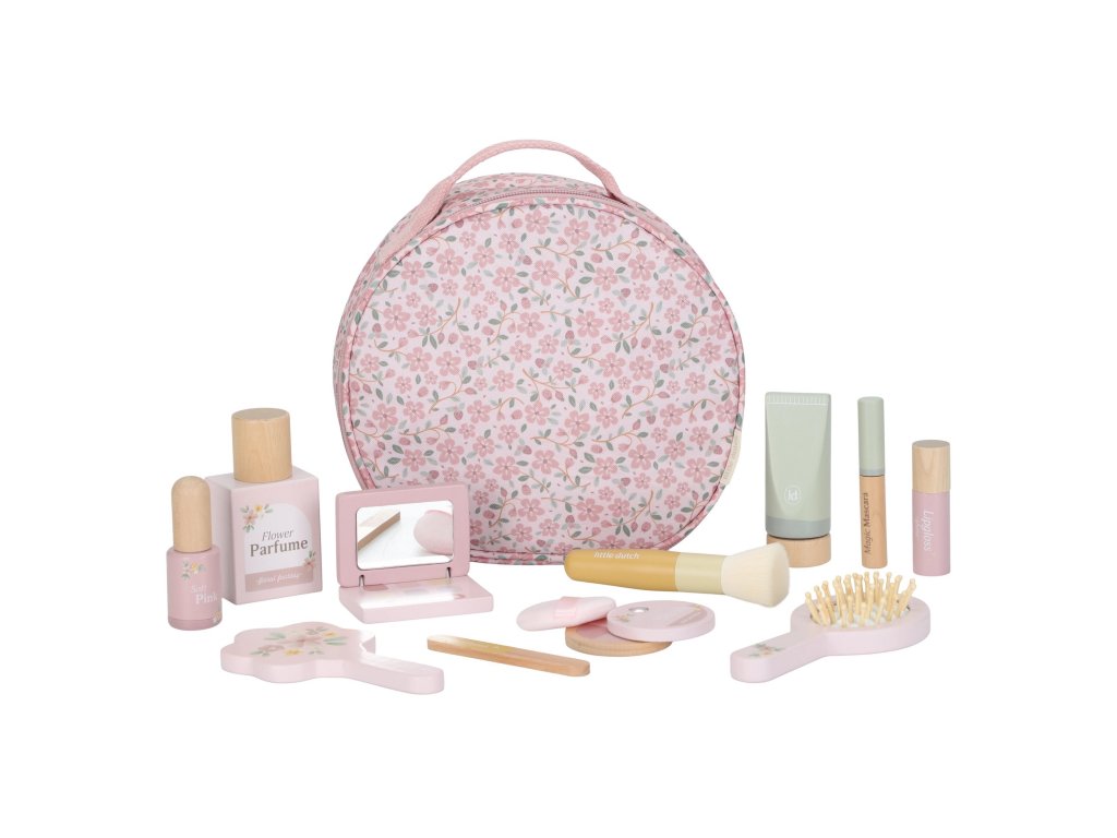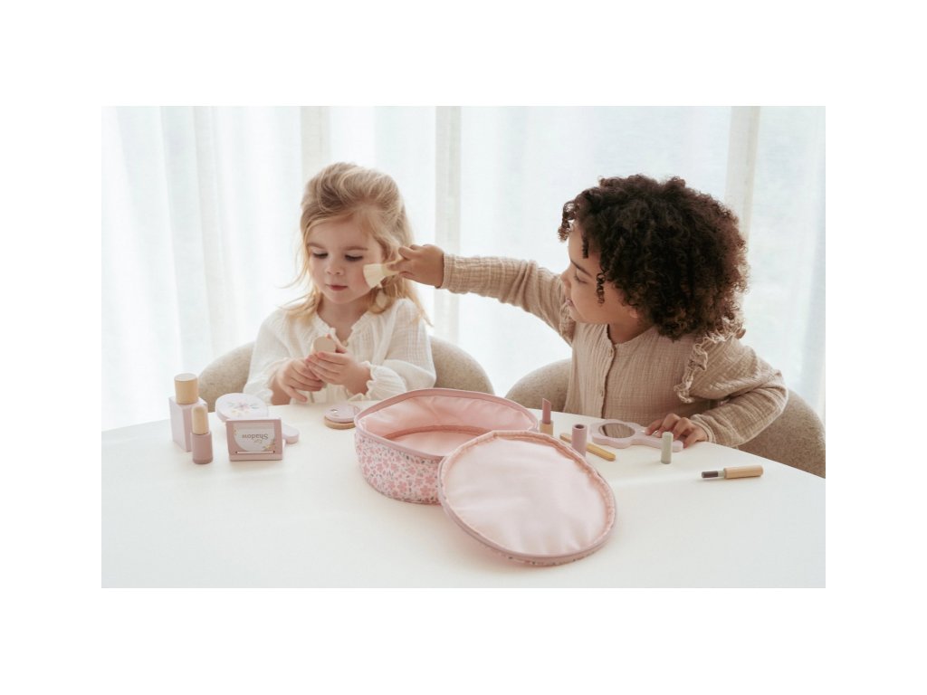 S touto krásnou dřevěnou kosmetickou sadou si vaše malá parádnice užije spoustu zábavy! Měkká látková taštička s květinovým vzorem ukrývá nejrůznější doplňky na hraní – zrcátko, lahvičku parfému, rtěnku, lak na nehty a další nezbytnosti pro každou malou stylistku.Sada je ideální pro hru na dospělé, podporuje rozvoj fantazie a sociálních dovedností – a to vše bez nepořádku. Malé ručičky si mohou trénovat jemnou motoriku a zároveň se cítit krásně, stejně jako maminka.