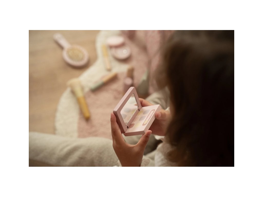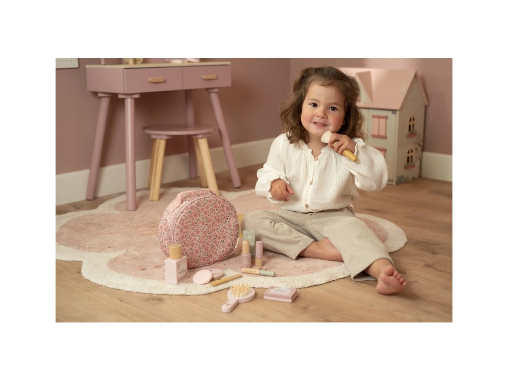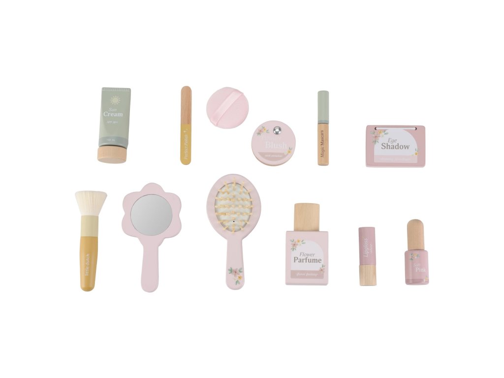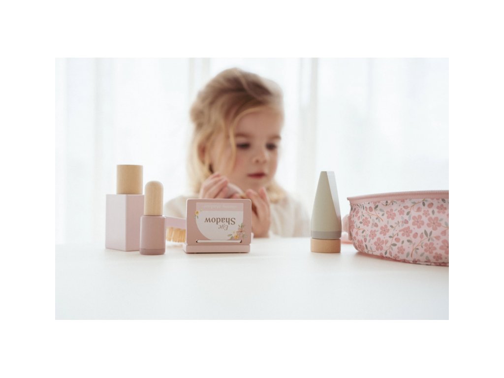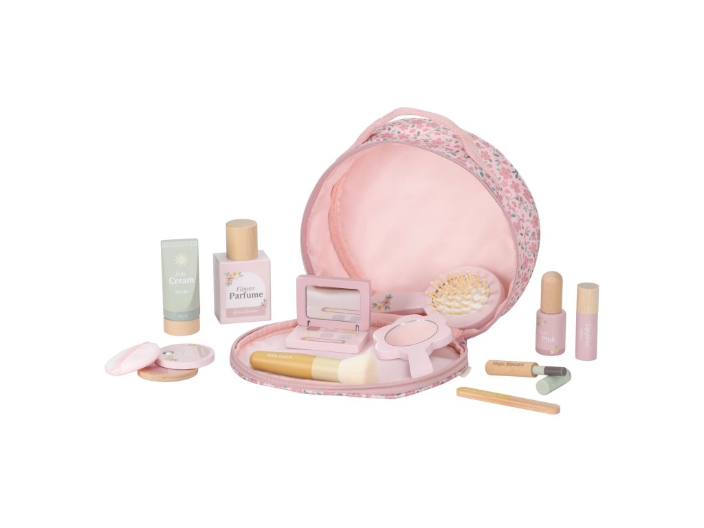 S touto krásnou dřevěnou kosmetickou sadou si vaše malá parádnice užije spoustu zábavy! Měkká látková taštička s květinovým vzorem ukrývá nejrůznější doplňky na hraní – zrcátko, lahvičku parfému, rtěnku, lak na nehty a další nezbytnosti pro každou malou stylistku.Sada je ideální pro hru na dospělé, podporuje rozvoj fantazie a sociálních dovedností – a to vše bez nepořádku. Malé ručičky si mohou trénovat jemnou motoriku a zároveň se cítit krásně, stejně jako maminka.