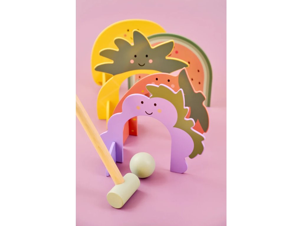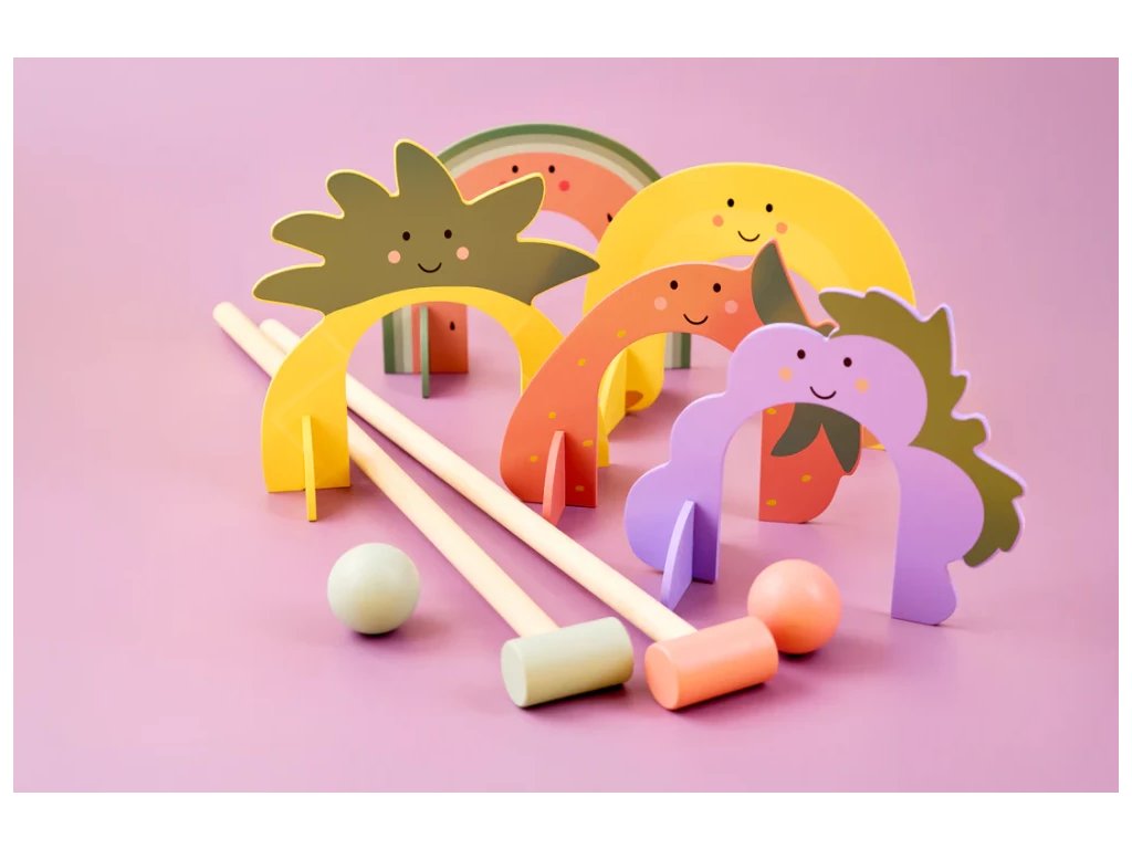 Kroketová sada obsahuje barevné branky ve tvaru ananasu, melounu, jahody, borůvky a manga.