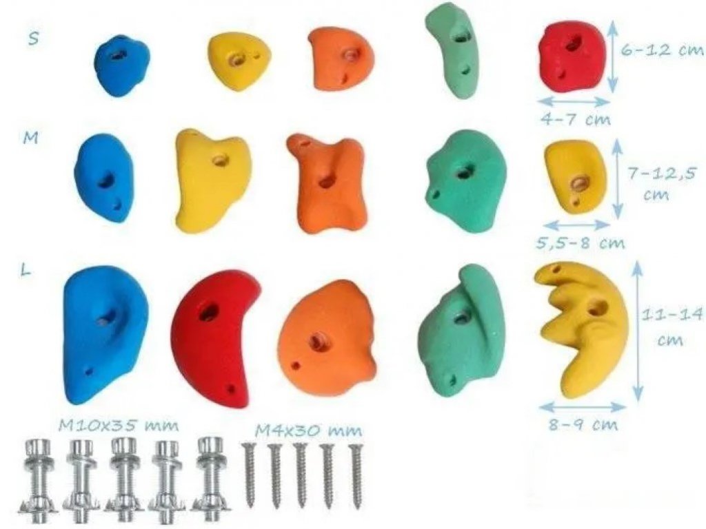 - Příslušenství - součástí lezecké stěny je 15 lezeckých chytů různé barvy a velikosti, které si můžete libovolně rozmístit po lezecké stěně. Balení obsahuje i veškerý montážní materiál.